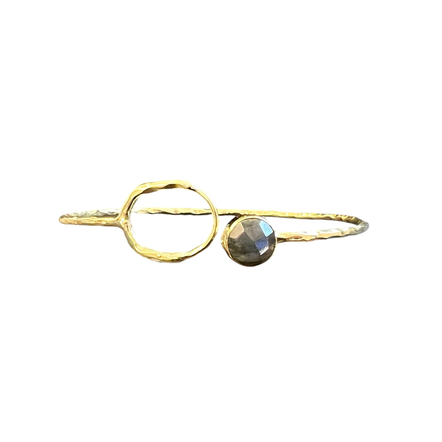 Beautifully simple yet unique brass cuff bracelet featuring encircled brass design around labradorite stone. Features center open and close design.