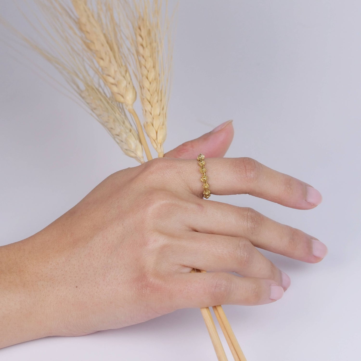 Brass band ring featuring flower design, available in size 5-9.