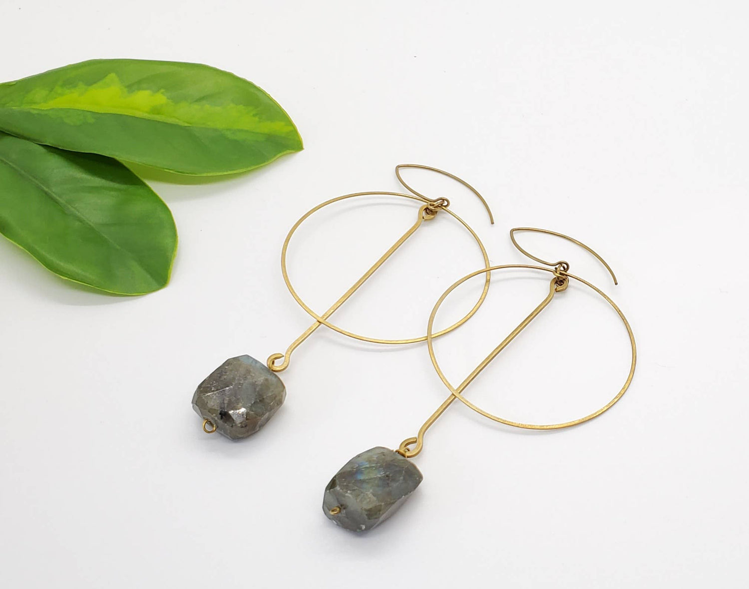 These fabulous brass hoops feature a bar design with a rough cut stone. Big and bold but still nice and lightweight!
