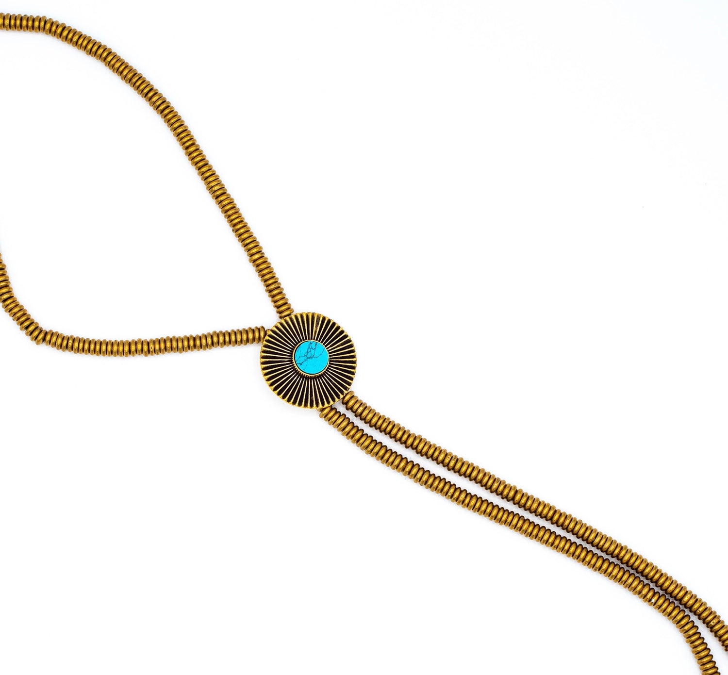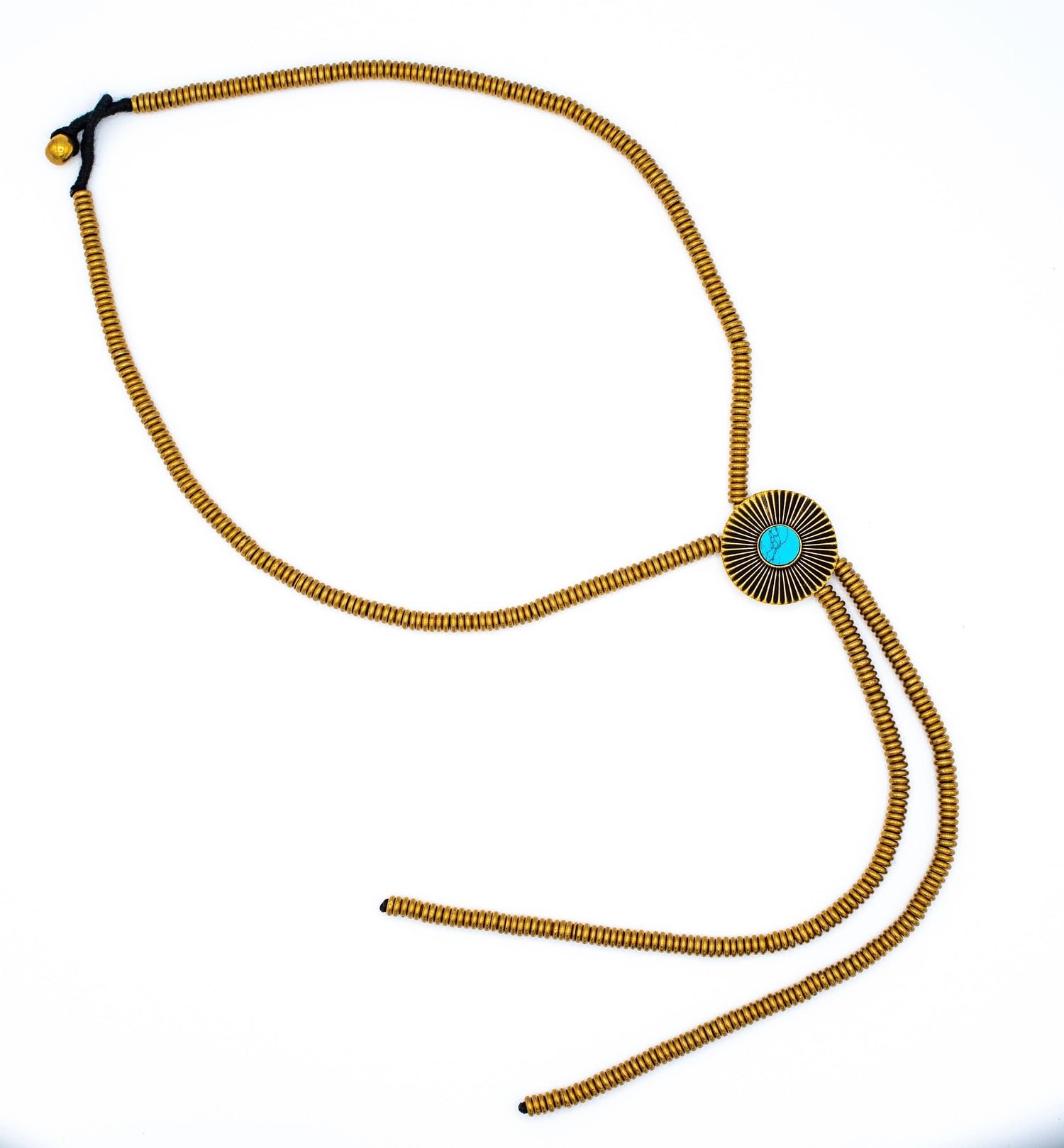 Stunning brass beaded bolo style necklace featuring sun burst turquoise pendant.