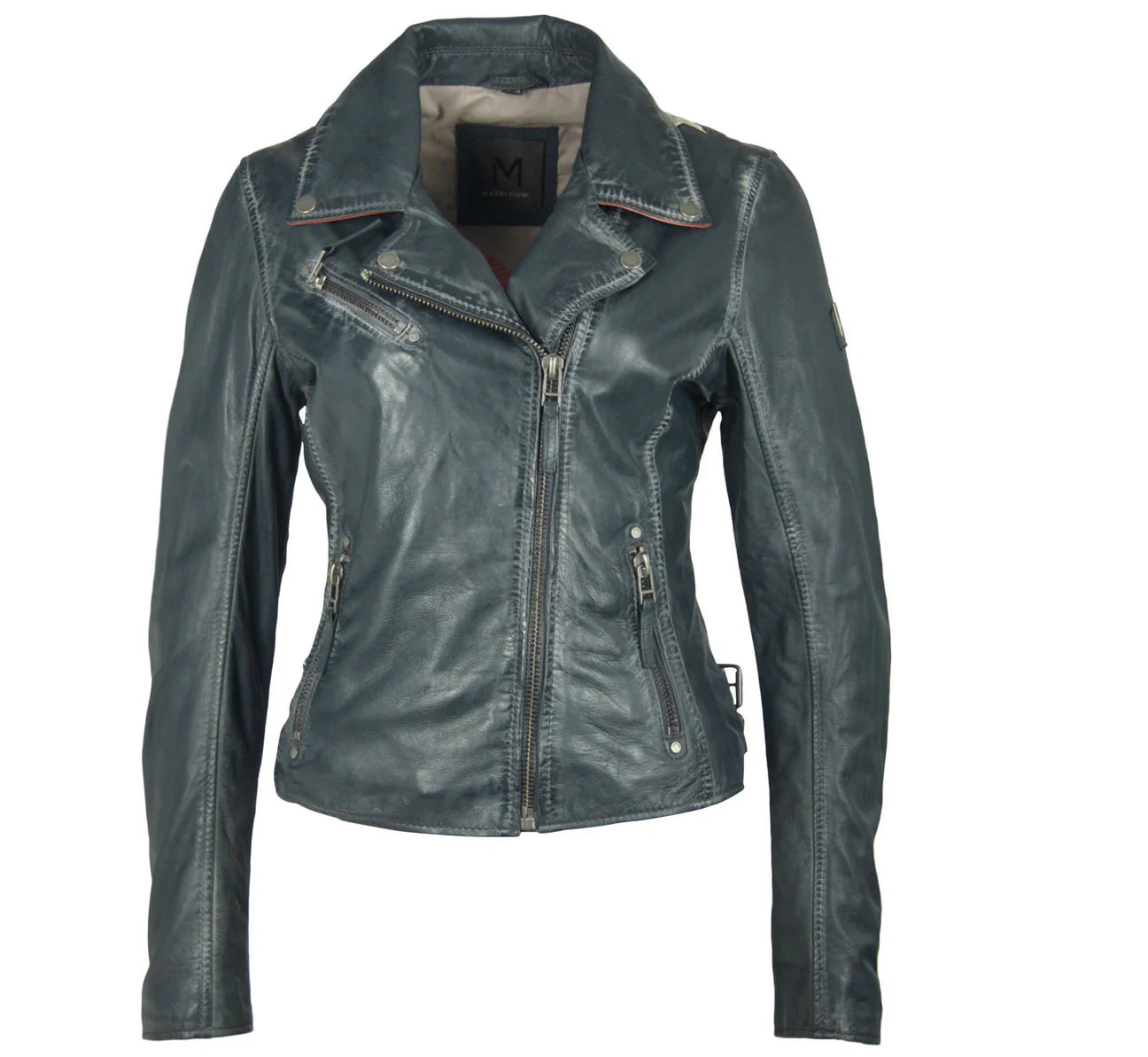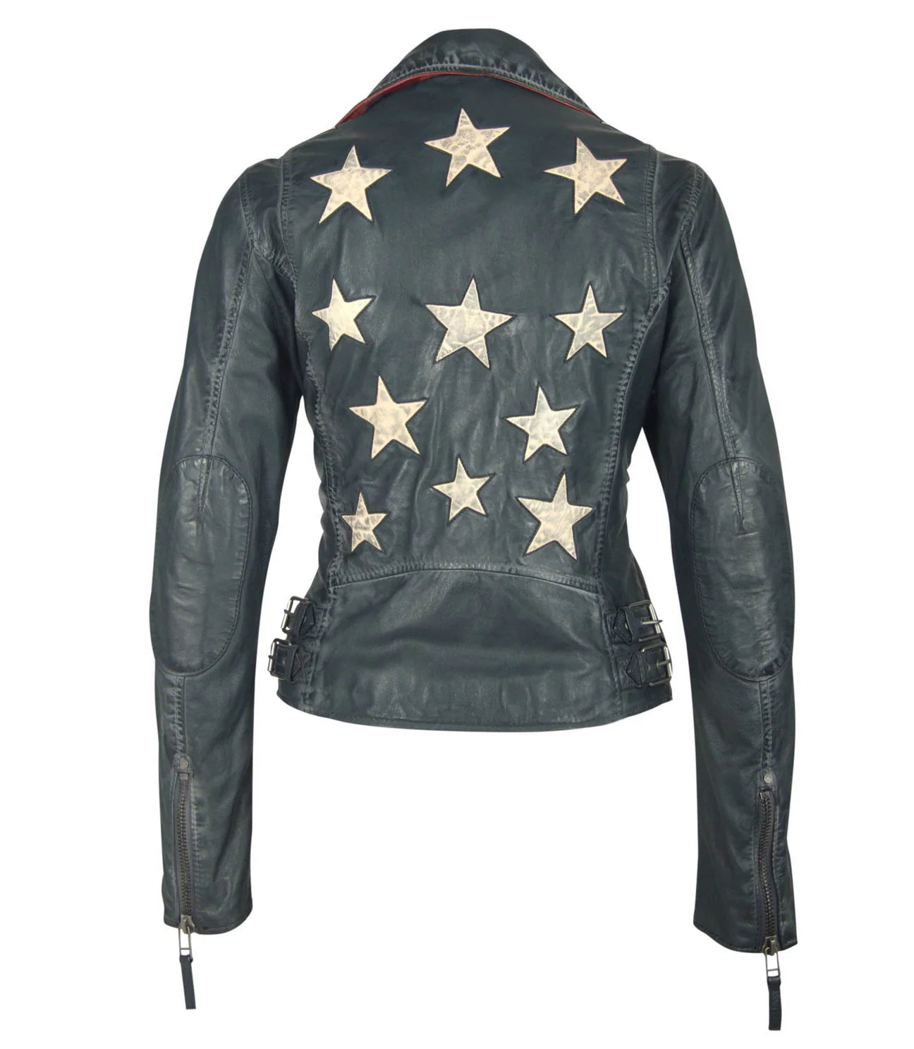 Ahhh… the famous star jacket – highlighted in many cameos on tv and movies, this style announces she has arrived. Made of 100% vegetable tanned and ethically produced lambskin leather, this jacket will catch the eye of many admirers. The seams are gently polished to ensure a distressed effect, the inside of the pockets, inside of the cuff zips and under the collar give a fabulous contrast pop of color!