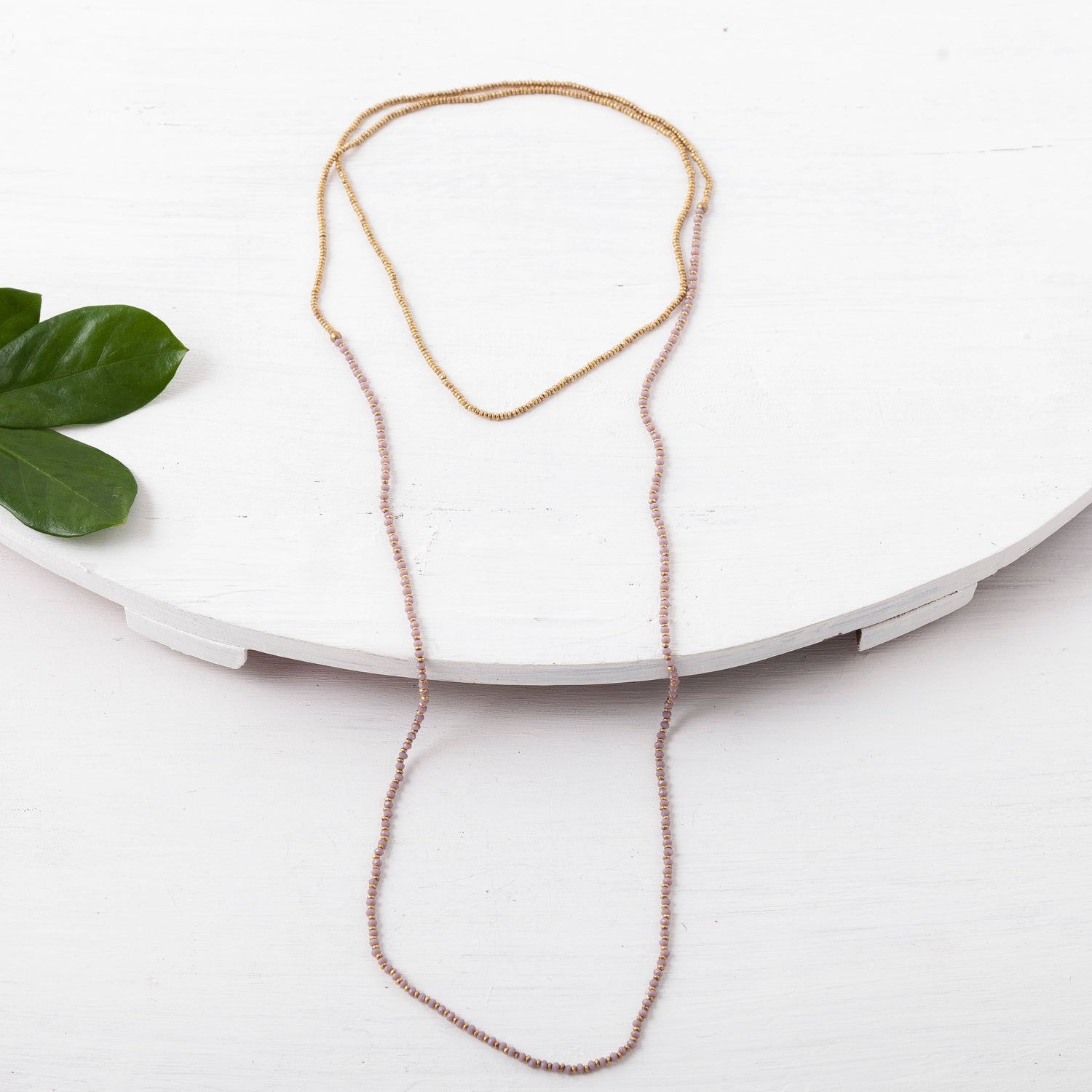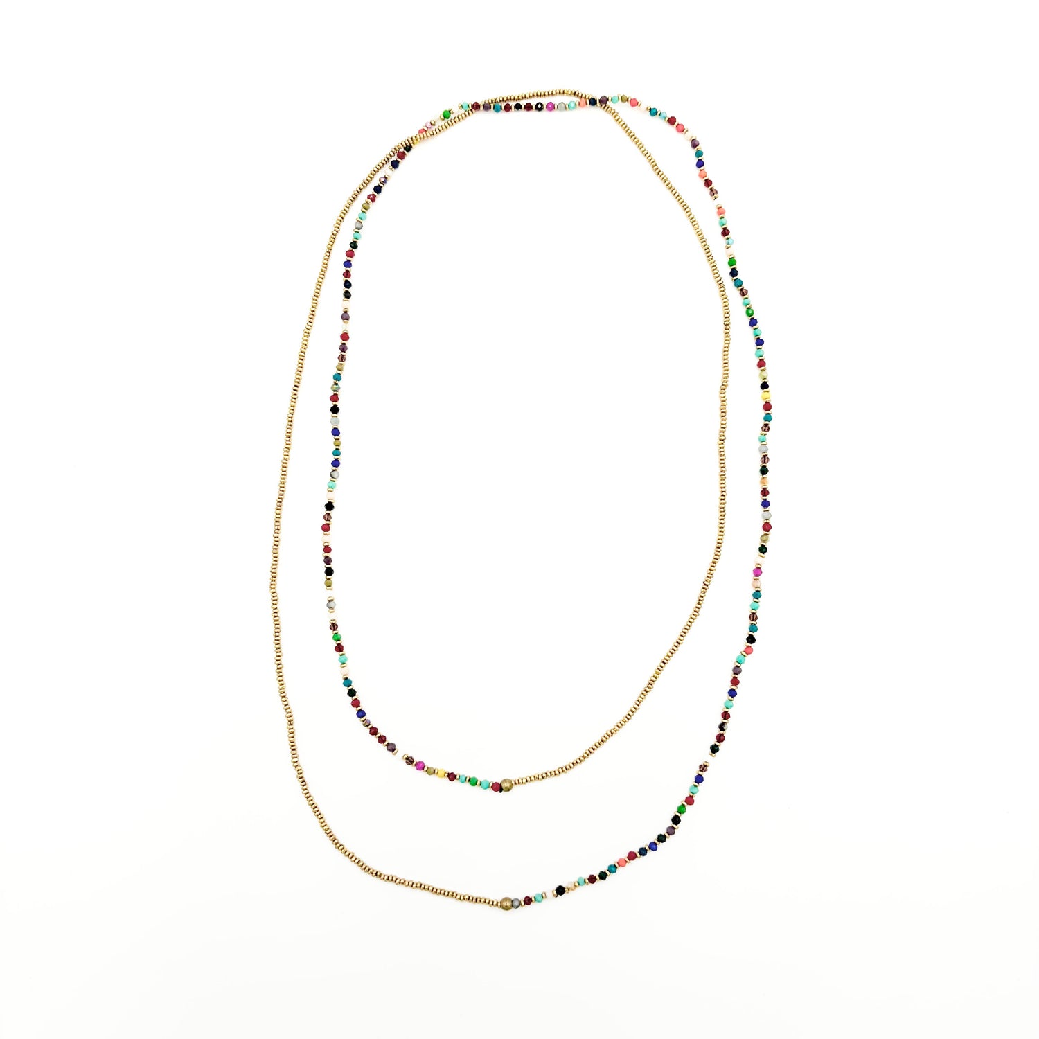 Our best selling color beaded strand necklace available in gray, red, lilac, black, turquoise, blue, royal blue, green and rainbow. Wear it long, doubled or tripled.
