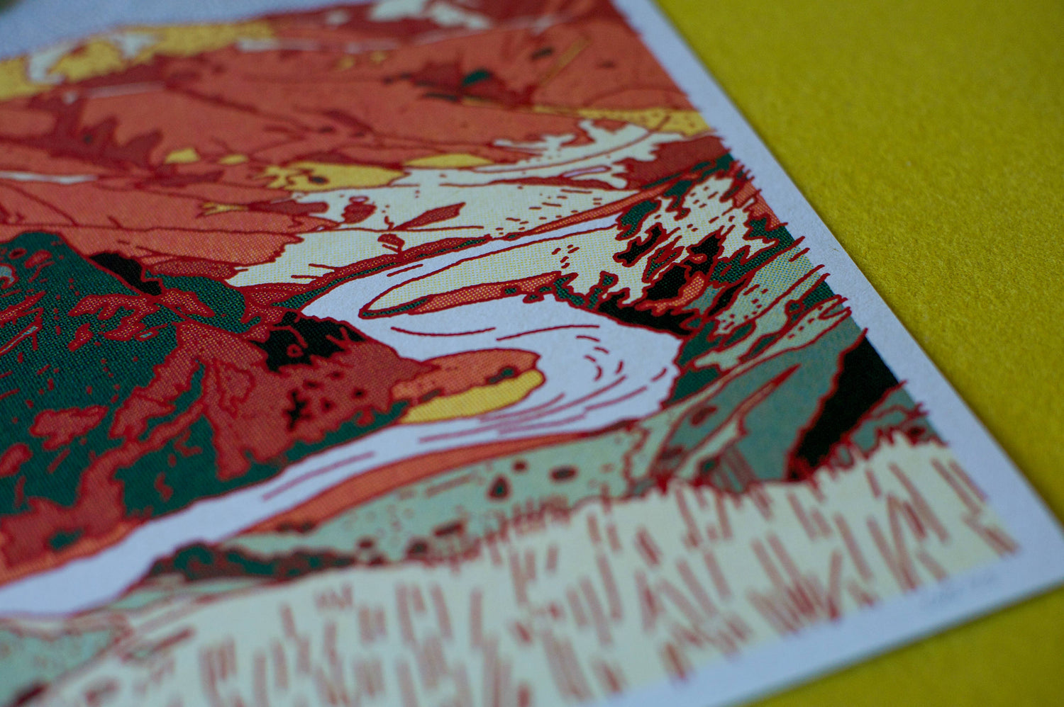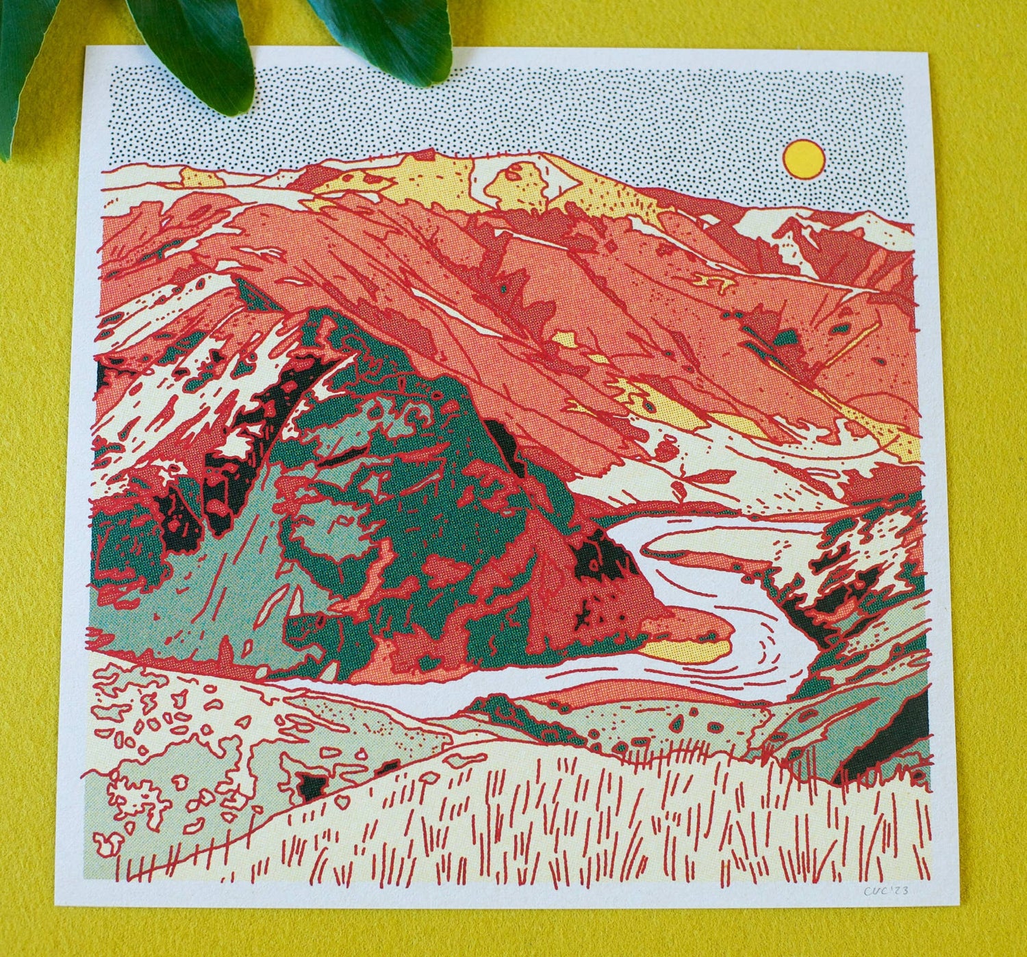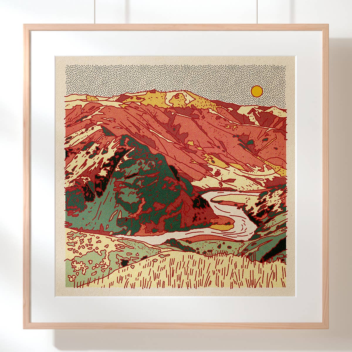 Desert Mountain 12"x 12" printed on 100% recycled 100#C French paper. The paper is a pulpy white texture with some color and paper texture printed on it.
