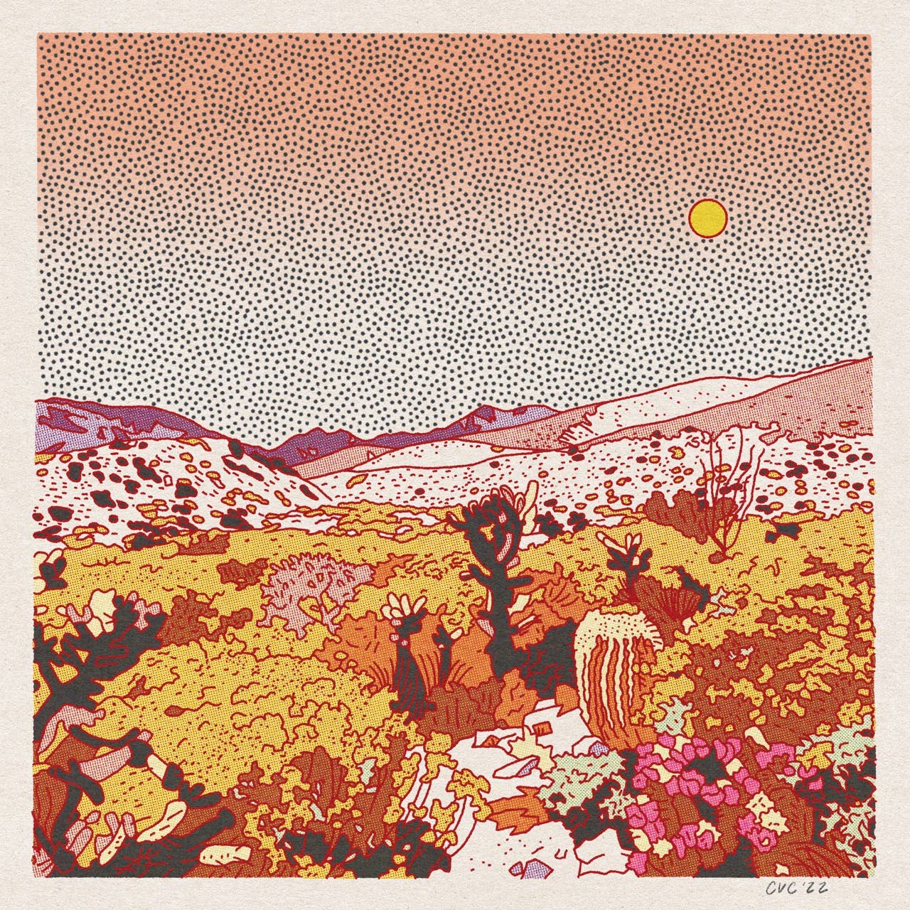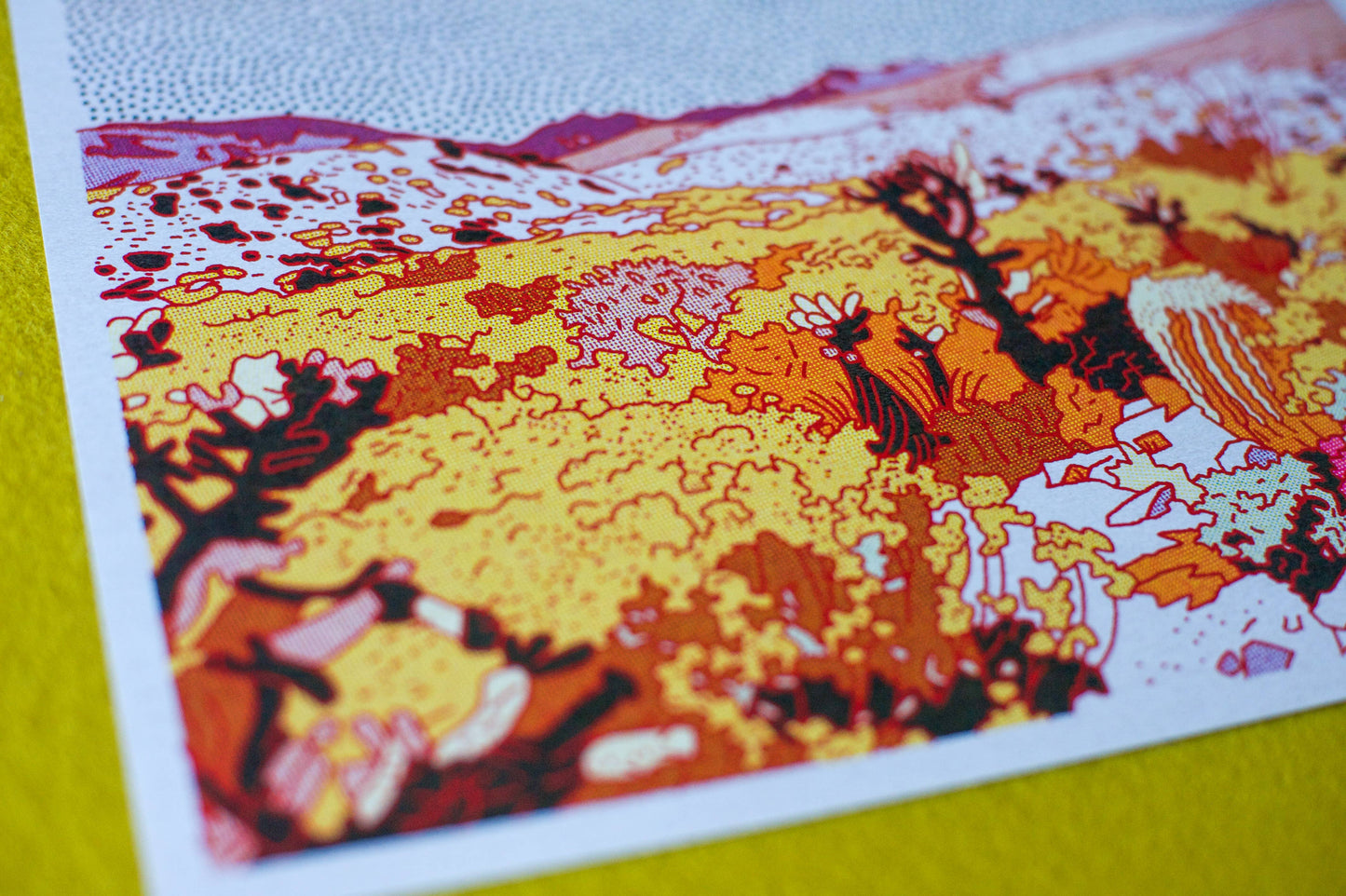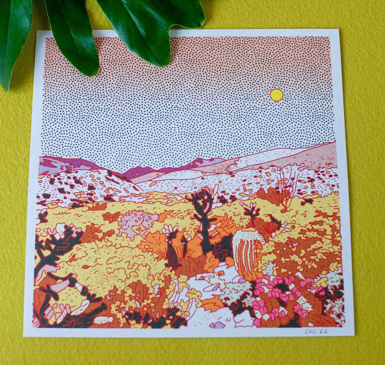 Desert Mountain 12"x 12" art print. Printed on 100% recycled 100#C French paper. The paper is a pulpy white texture with some color and paper texture printed on it.