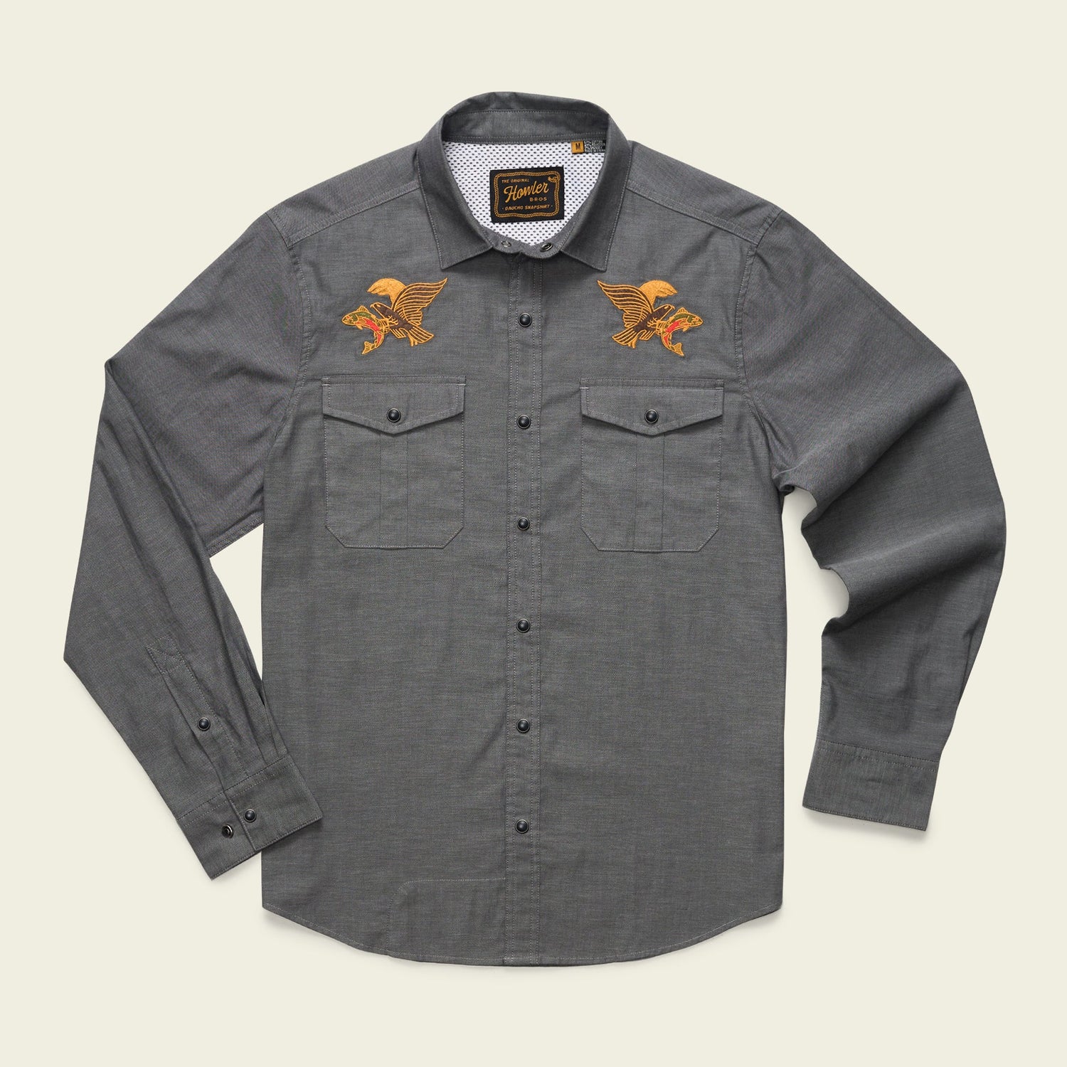 Our desire to make the Gaucho Snapshirt is one of the reasons we started Howler Brothers in the first place. We wanted to transform the vintage western shirts of the past into something technical and wearable in everyday life while maintaining a little of their quirky nature and penchant for unique, embroidered artwork. We succeeded in a big way by making ours out of lightweight, quick drying cotton-poly blend and adding a cooling mesh-lined vented back yoke to keep it cool when the temperatures are cooking. We threw in pleated chest pockets, pearl snaps, and an ever-evolving slate of custom embroidery.