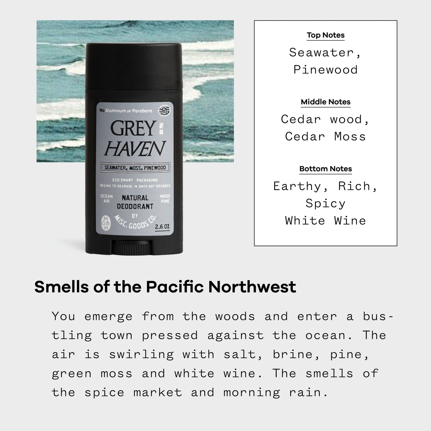 NATURE'S NATURAL FRAGRANCE BLEND: Immerse yourself with our unique and meticulously crafted earthy scents Misc. Goods Co. Greyhaven fragrance is inspired by the complex aromas of the earth and the relaxing scent of coastal fresh air. A serene refreshing scent that lasts all throughout the day.