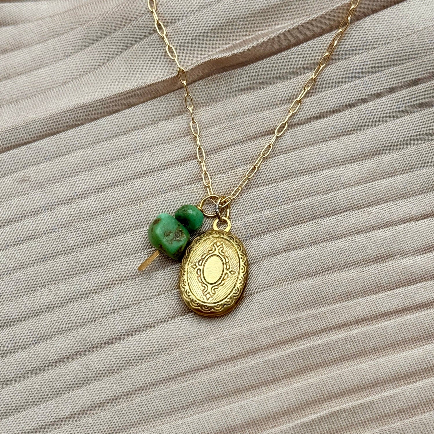 The Capsule Necklace features a detailed locket—available in small or large—paired with natural turquoise chip beads- designed to hold a secret, a memory, or a tiny treasure. Hanging freely on a sterling silver or 14k gold fill chain.