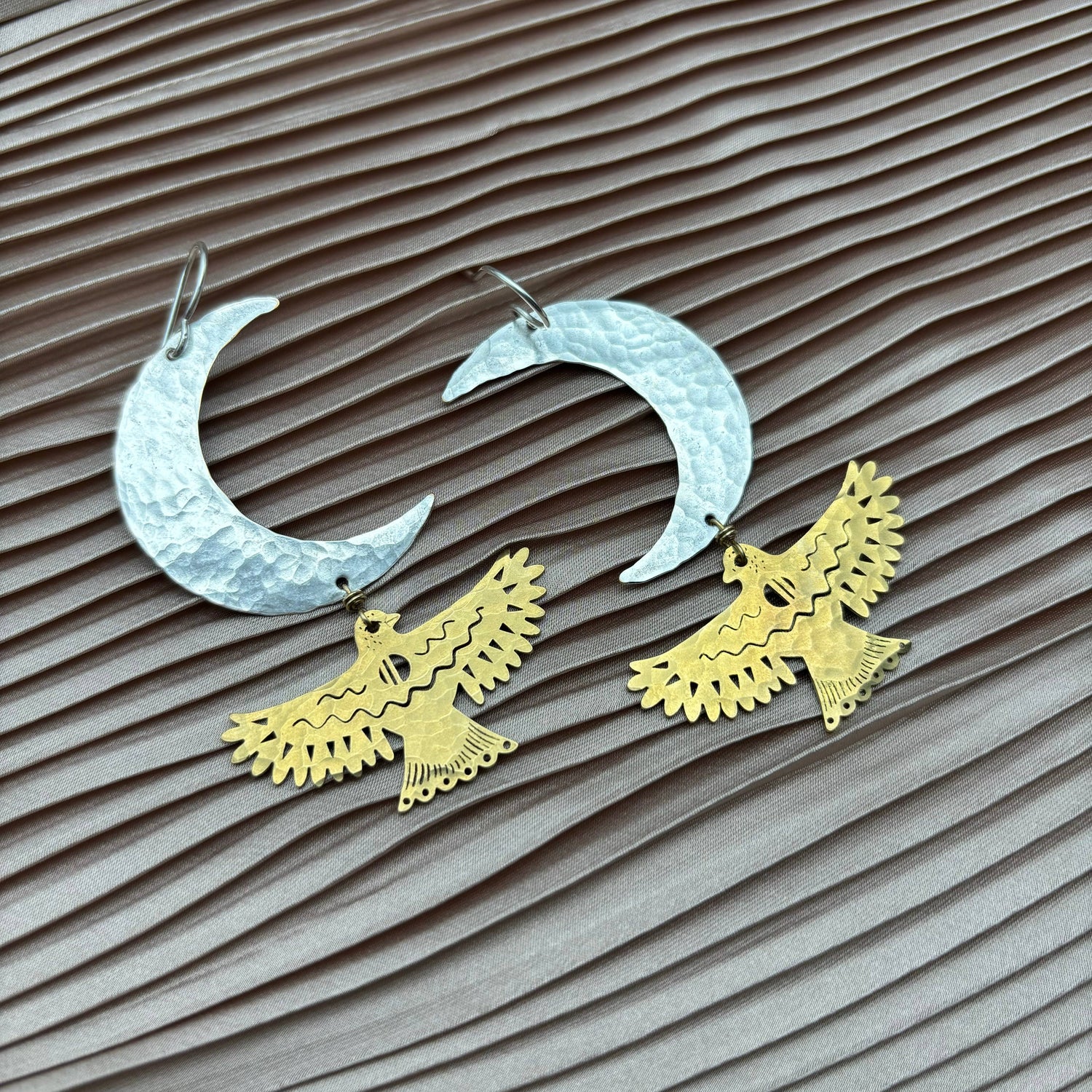 Gold or silver moon and bird pendants that hang from 14 karat gold filled or sterling silver handmade ear wire.