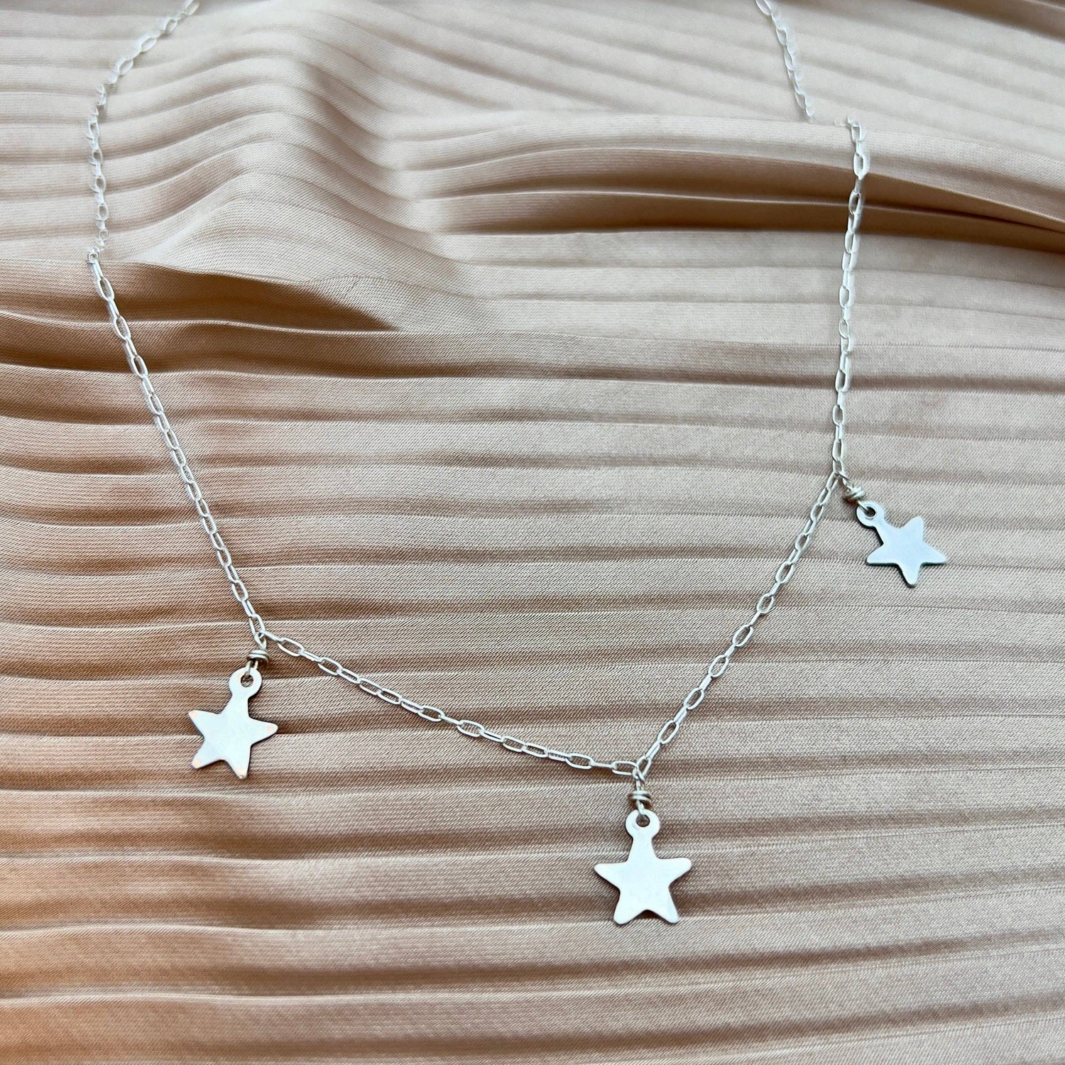 Three hammered gold or silver star pendants that hang from a sterling silver or 14 karat gold filled chain.