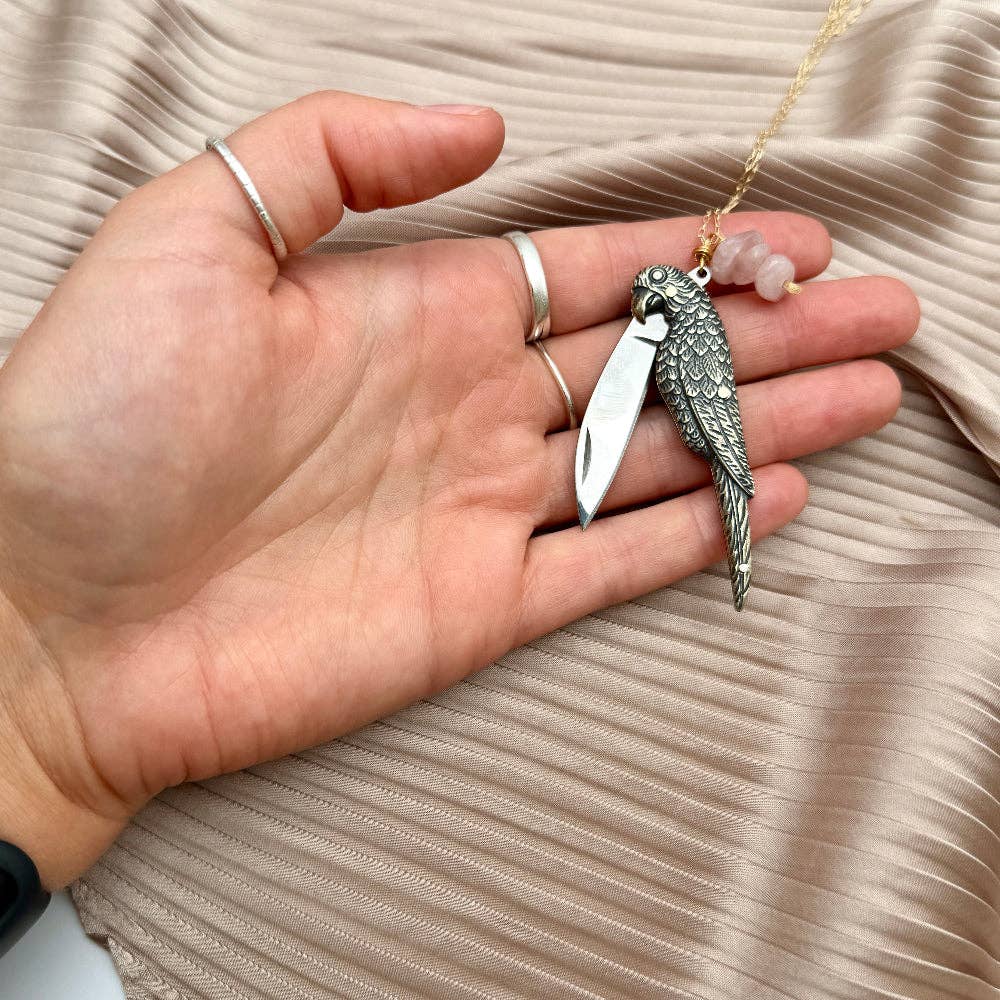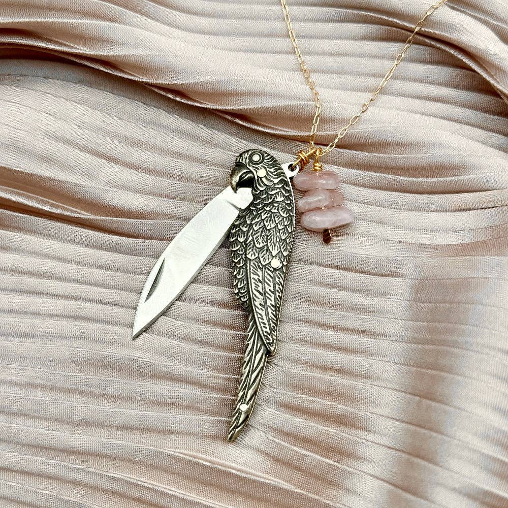 The Isla Rosa Necklace features a finely detailed parrot utility charm paired with natural rose quartz nugget beads—each element hanging freely from a sterling silver or 14k gold fill chain.