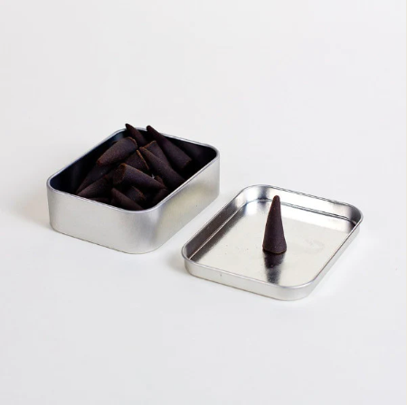 Our incense cones are hand-dipped and are housed in a sturdy aluminum tin; the lid can be used as a burning surface. Each cone will burn for 20-30 minutes with a scent longevity of 2-3 hours. 25 count.
