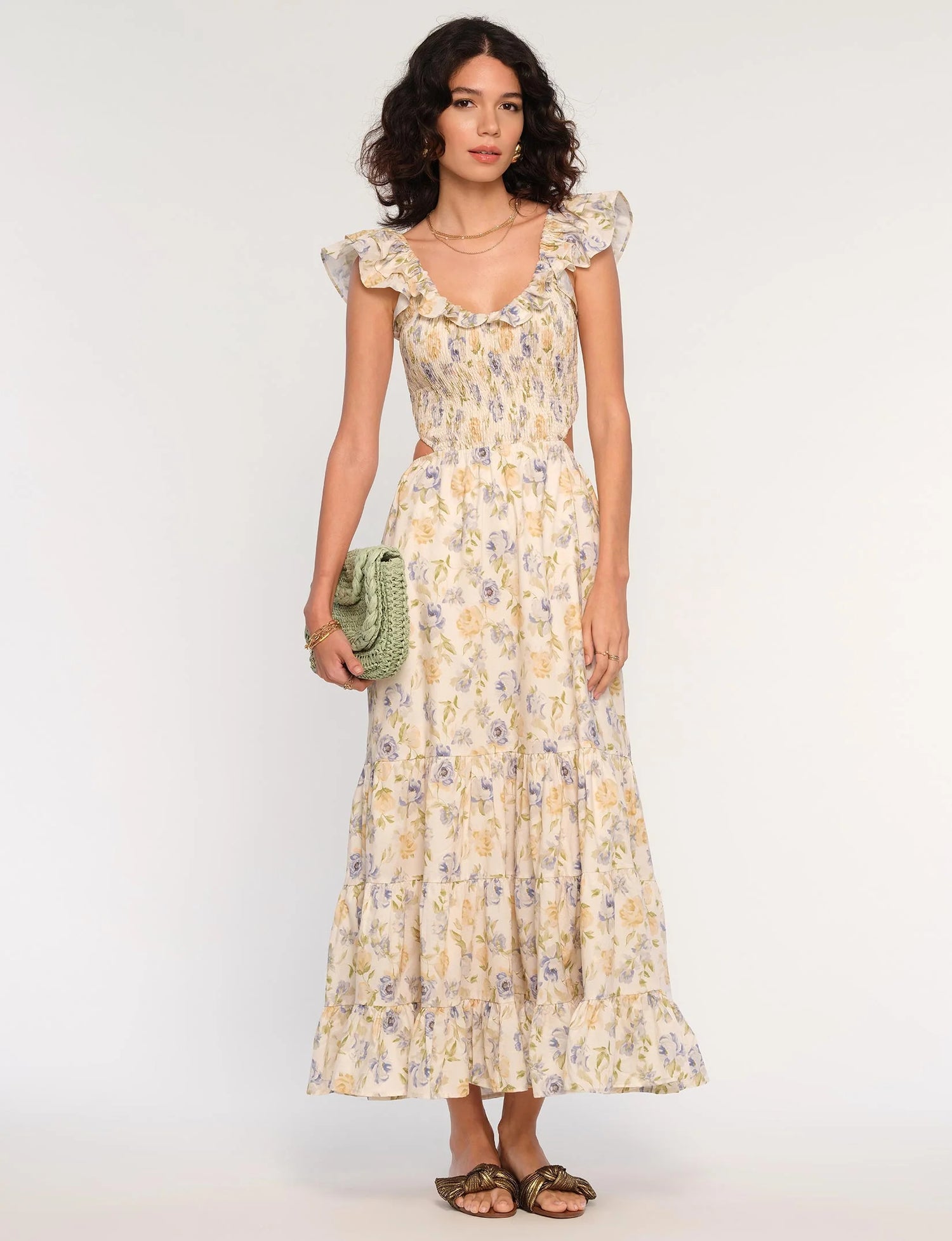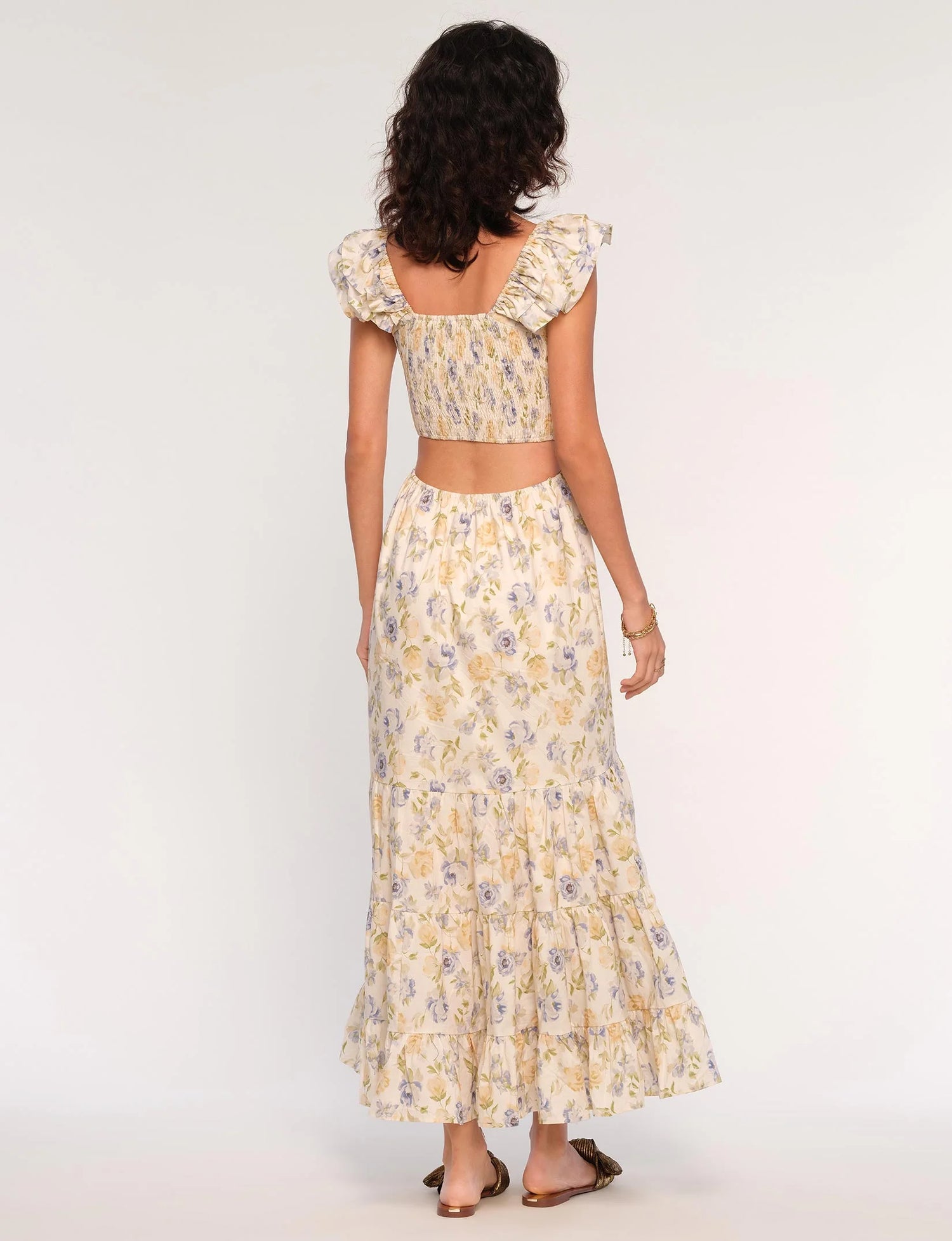 The Irene Dress features delicate ruffle details in a floral printed, jacquard crepe. The tiered skirt and ruffled neckline add extra charm to this easy midi. Pair with sneakers or sandals for that perfect casual yet polished look.