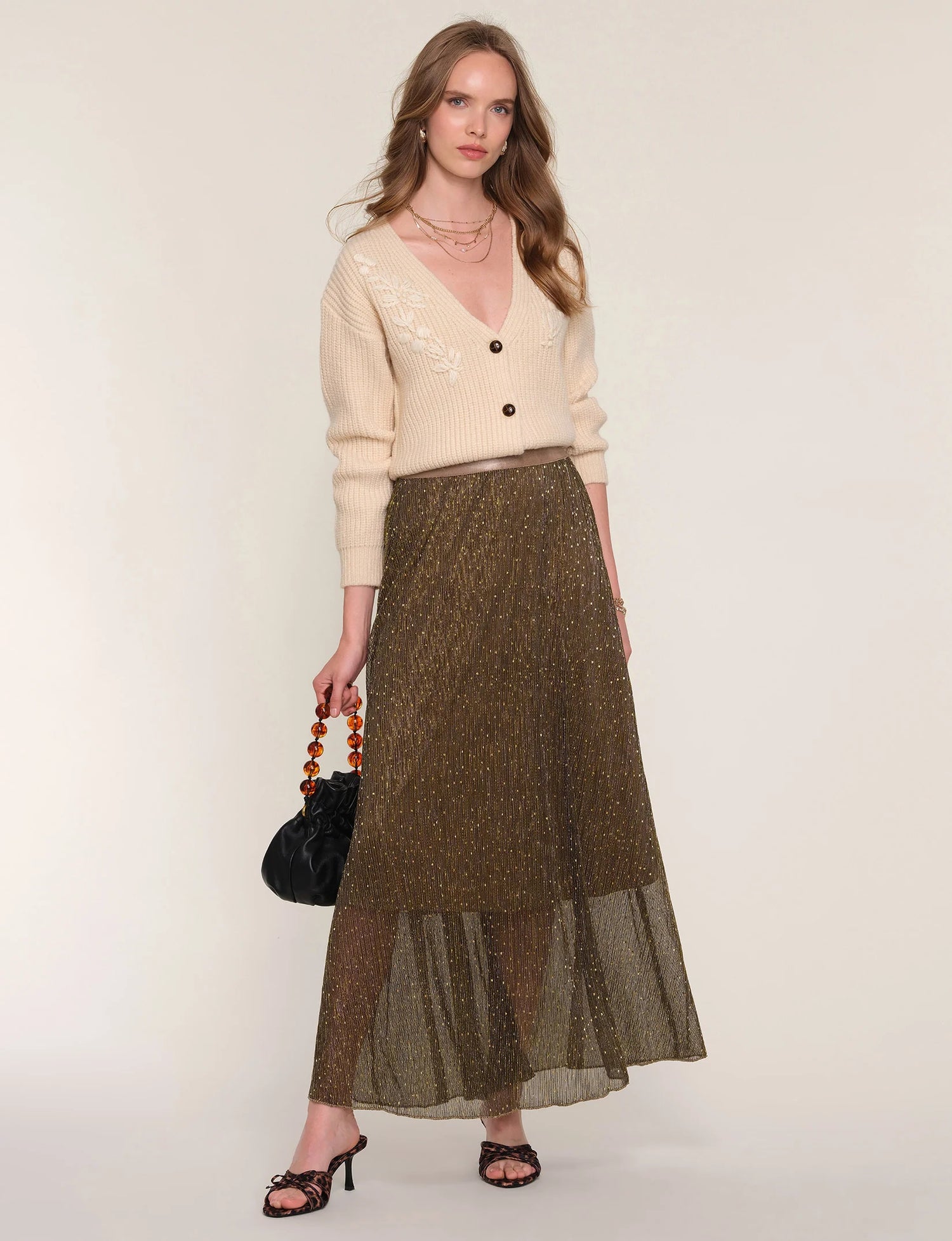The Kaine Skirt is a simple maxi skirt with an elastic waist. It showcases a sheer crinkled fabric with a delicate foil print throughout.