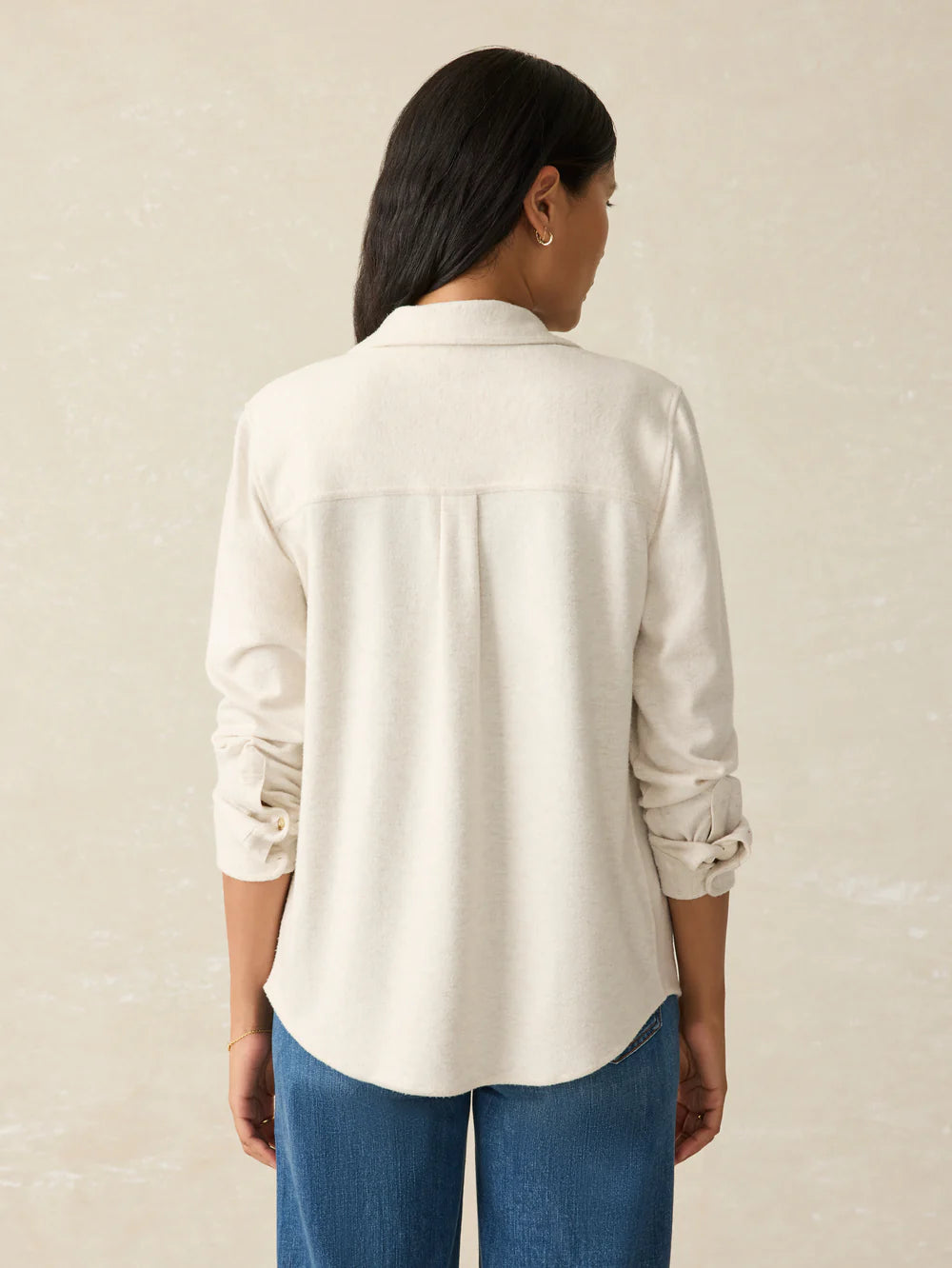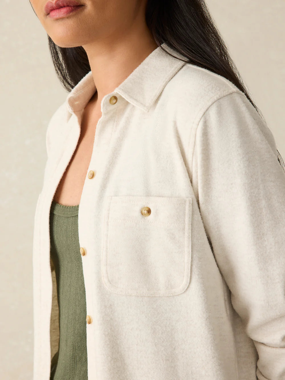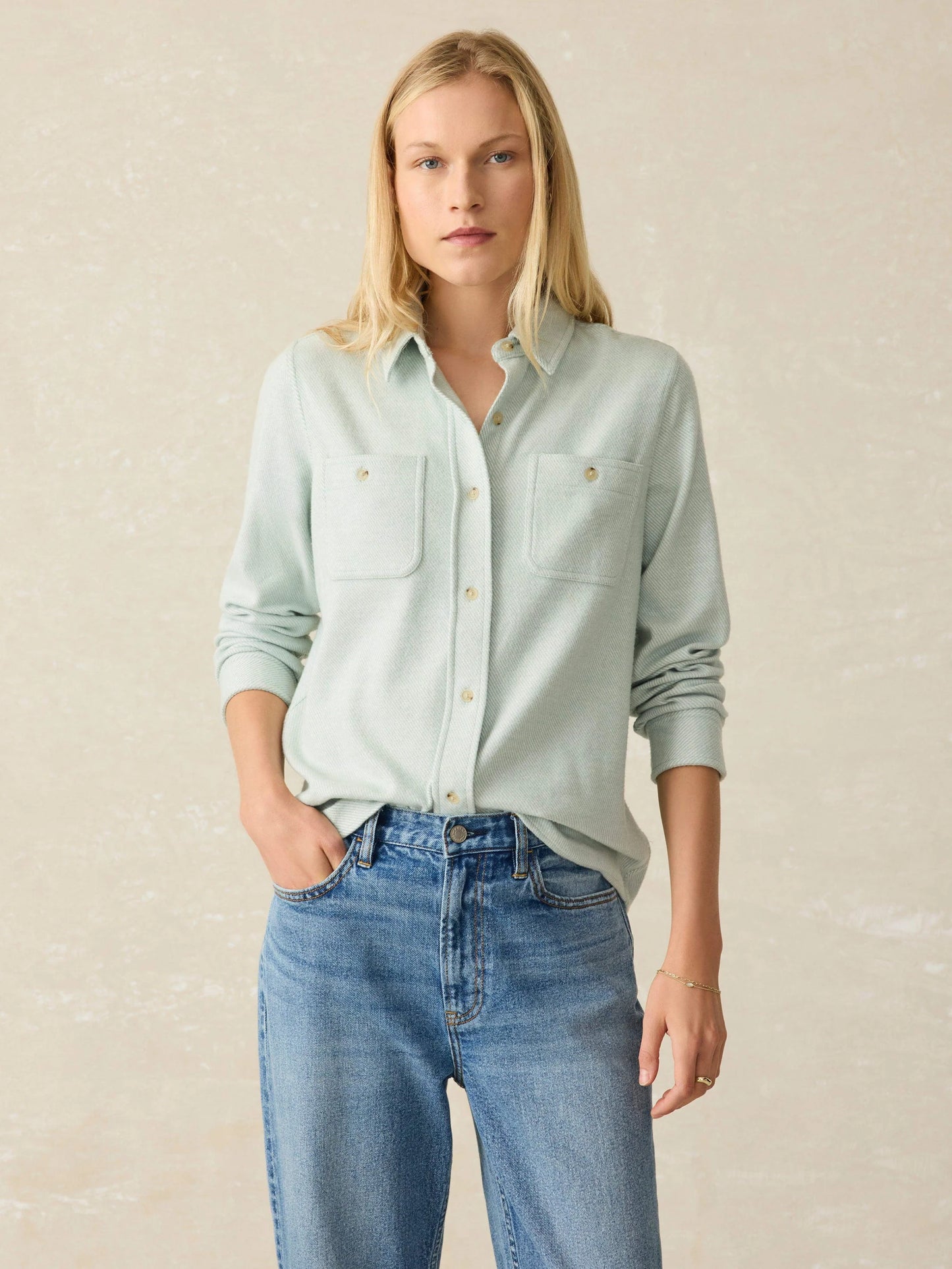 - Detail: Spread collar, button front. Long sleeves with button cuffs. Chest patch pockets, topstitch detailing. Shirttail hem.