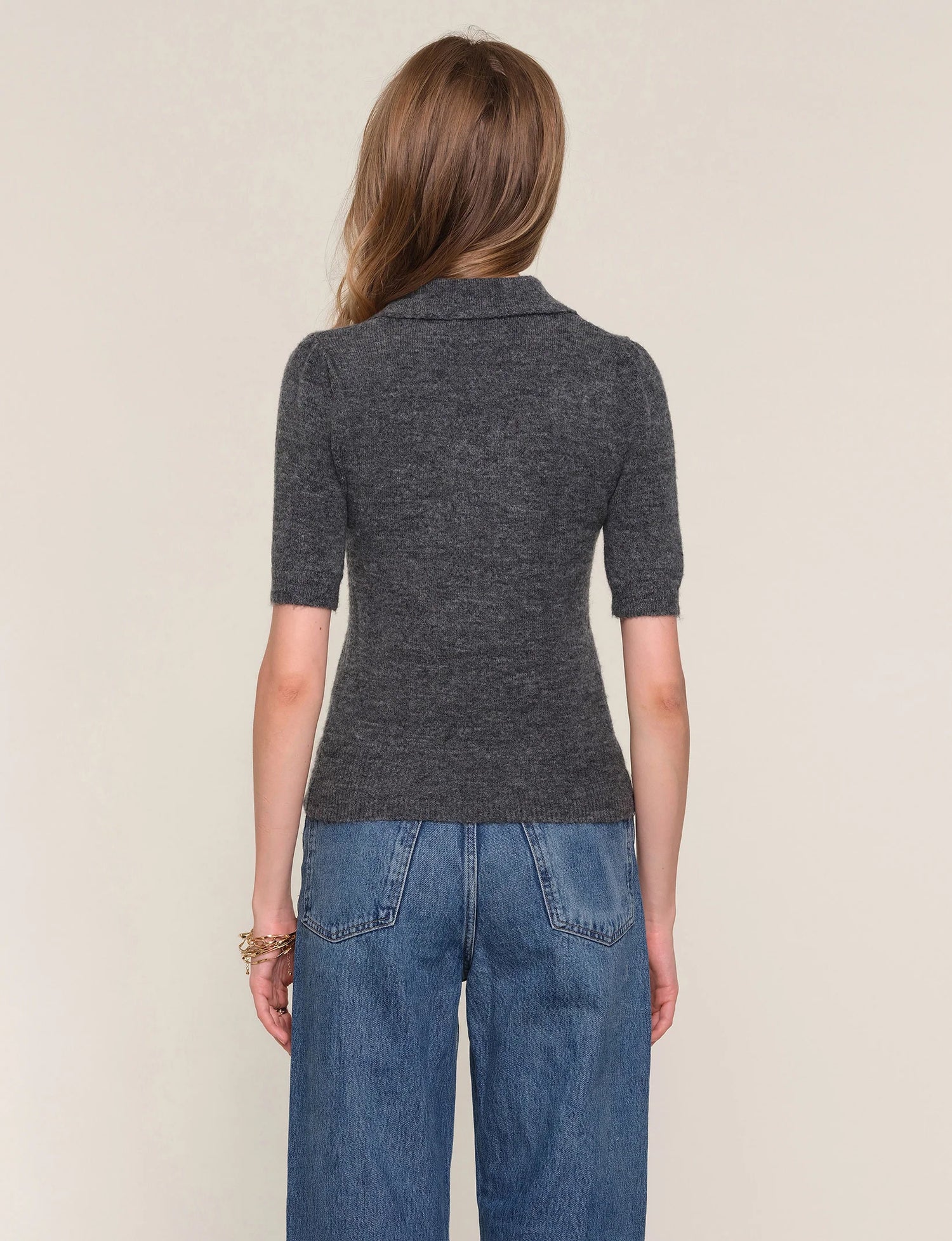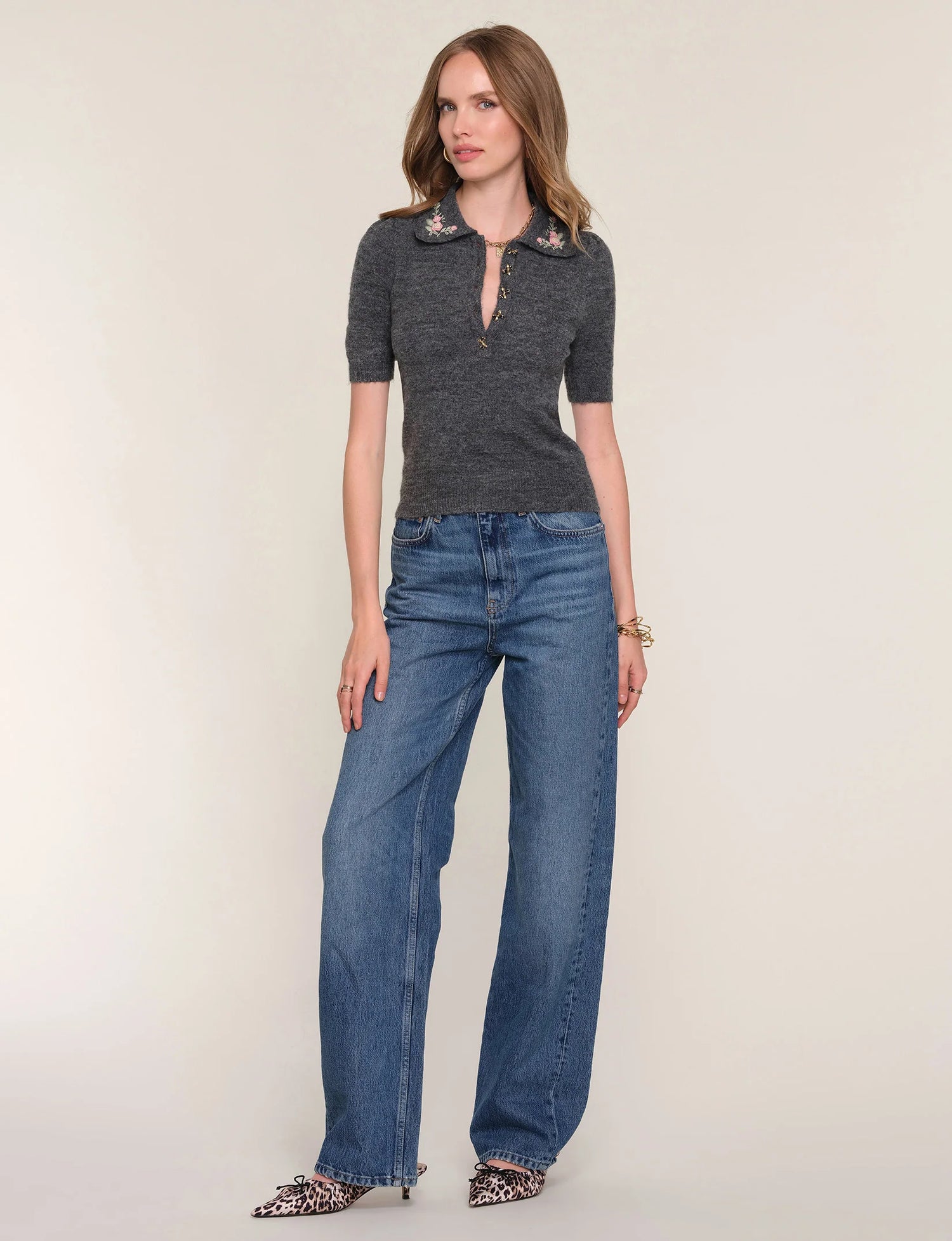 The Liza Top is a soft, polo knit. It has a slim fit and features a floral embroidery at collar tips.