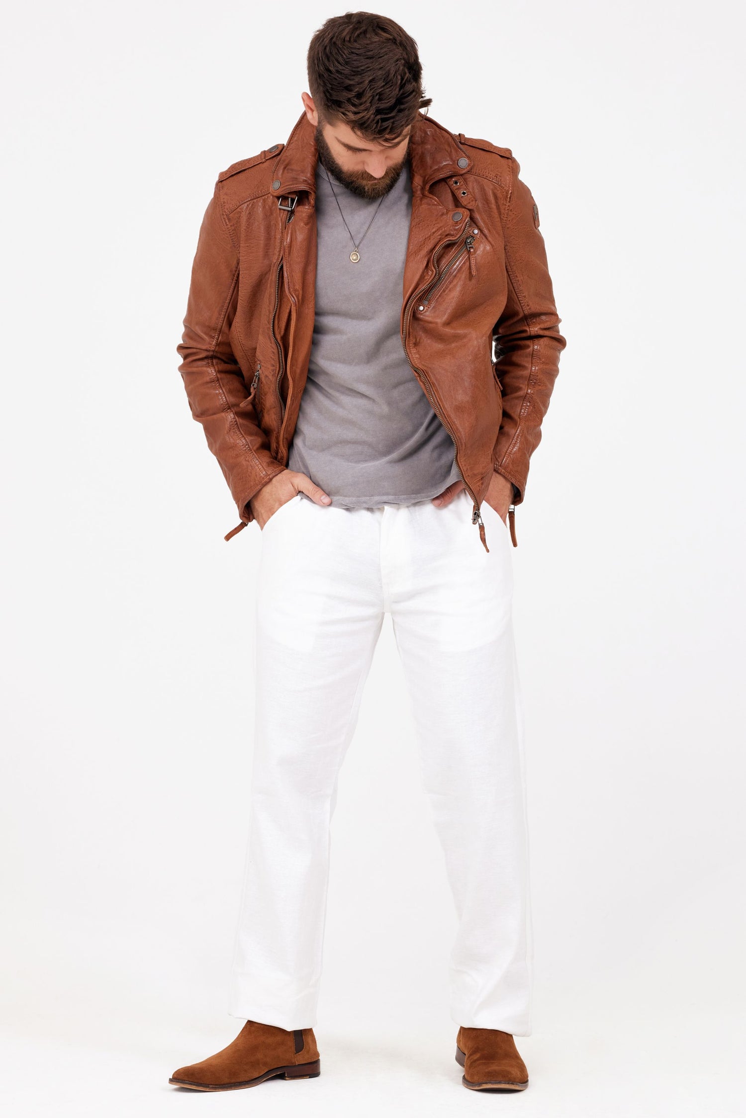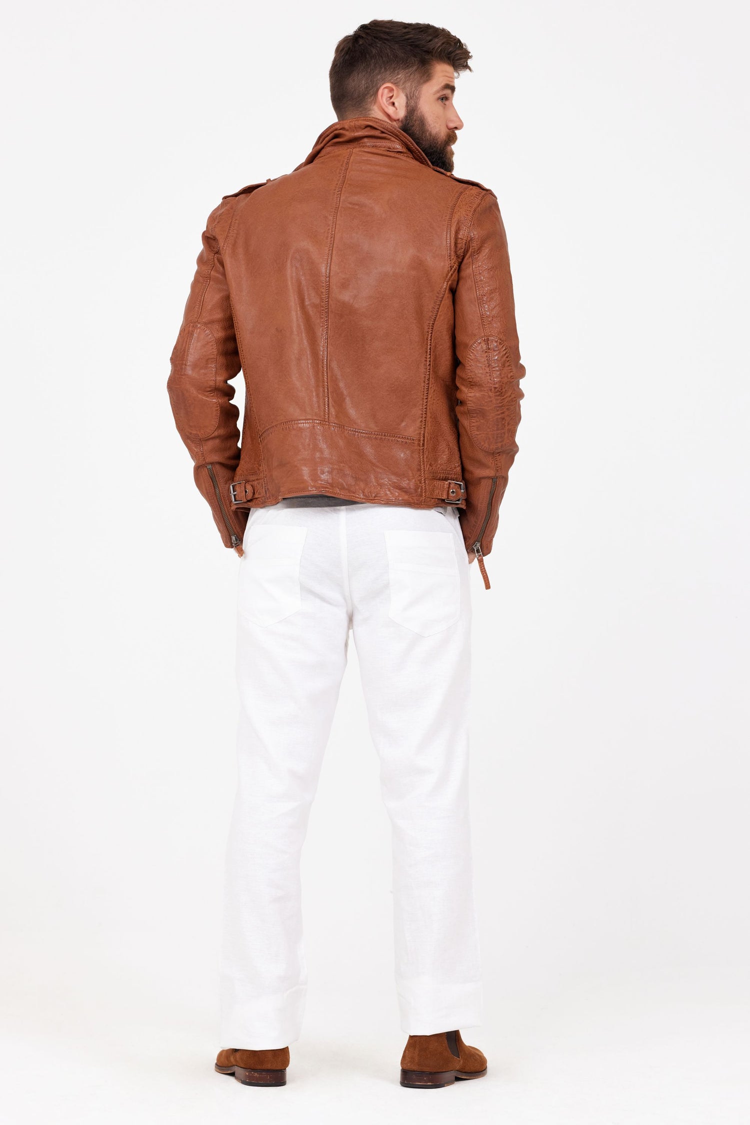 Cognac lambskin leather. Runs small so sizing up is reccomended. All the right details, Malic is a moto jacket with buckled collar for added sleekness.