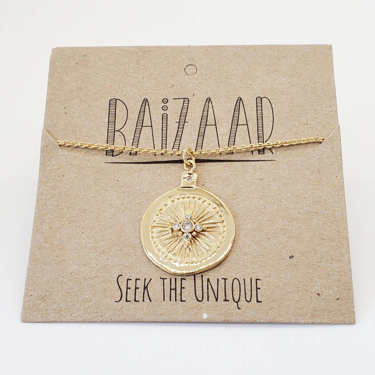 Immerse yourself in the rich culture and craftsmanship of India and Thailand with Baizaar's Polished Brass Crystal Medallion Necklace. This unique piece of jewelry is a testament to the brand's commitment to ethical sourcing and support for fair trade practices. Reflecting an adventurous mix of traditional and innovative work, this pendant necklace is sure to add a touch of soulful spirit to your collection.