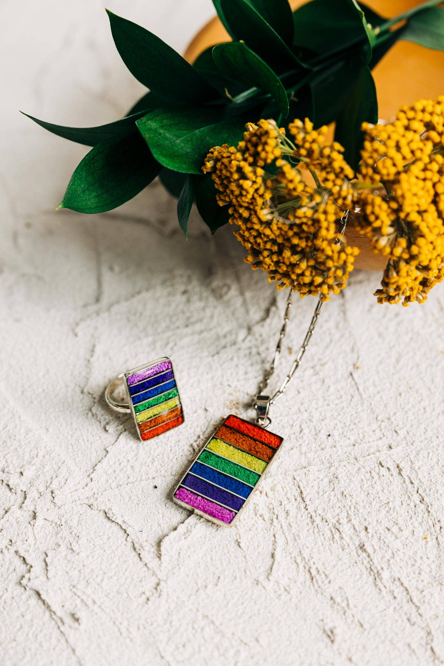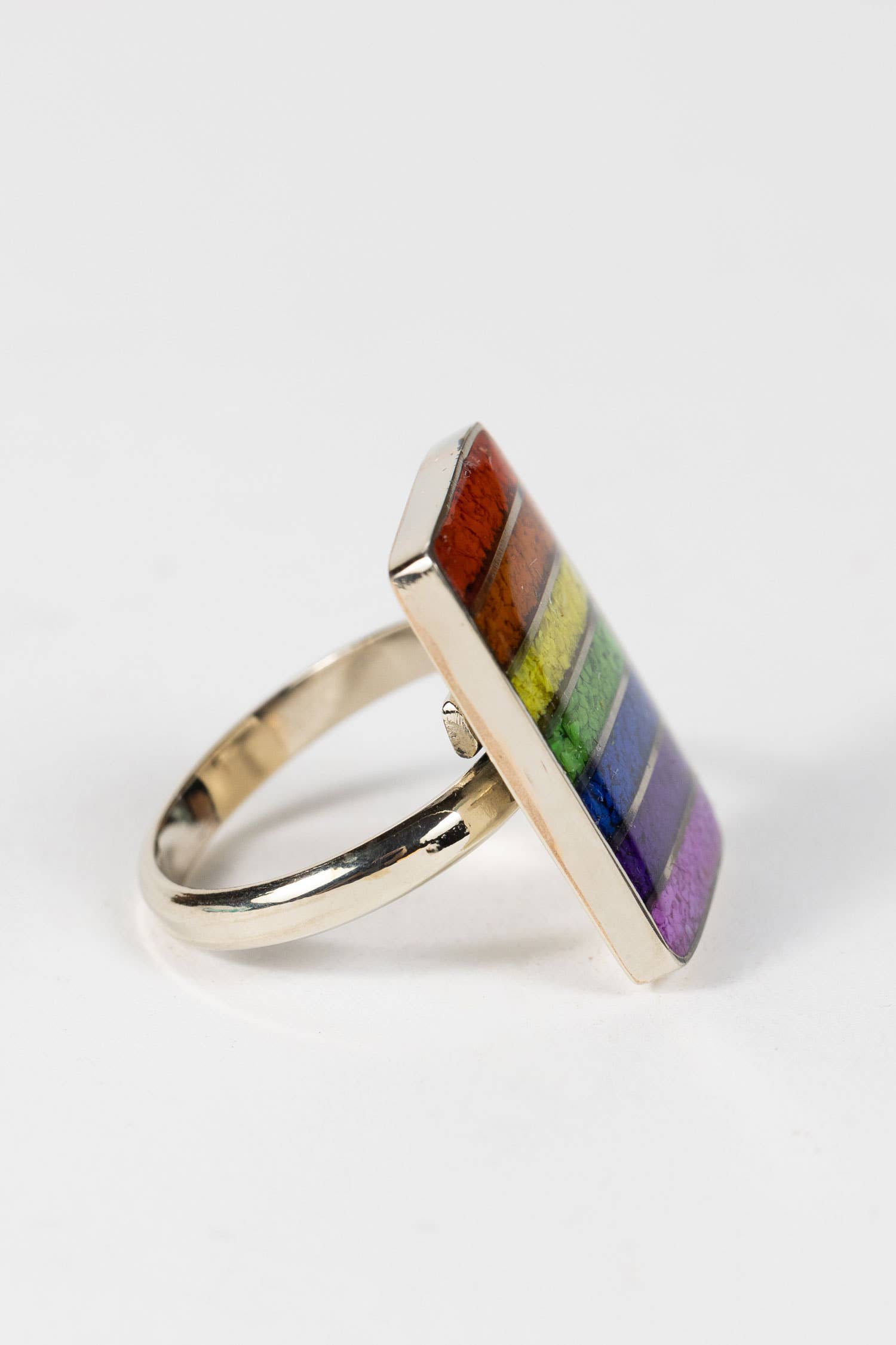 Fly your true colors when you don the Rainbow Banner Ring. An adjustable cuff ring made of alpaca metal with a handcrafted resin banner sporting 7 colors of the rainbow with silver stripes between each. Fair trade artisans in Peru crush stone then custom color the powder in each hue before setting them in resin.