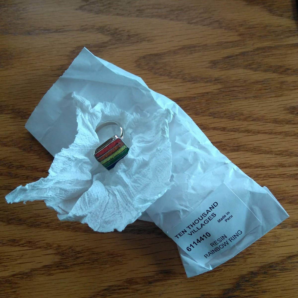 Materials: Alpaca metal, resin - Resin banner is 1" x .6". In neutral position, the ring opening measures 1.8cm in diameter, but is adjustable. - Pictured with our Rainbow Banner Necklace (sold separately) - Handcrafted in Peru