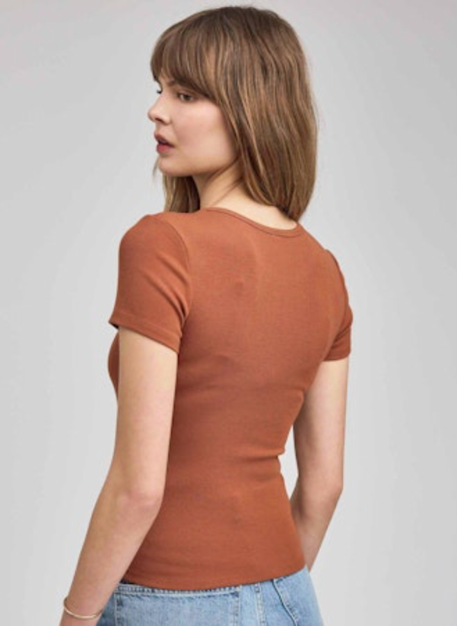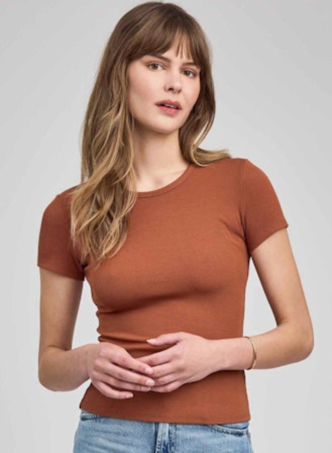 The Reagan t-shirt is made of a stretchy ribbed fabric that hugs the body. The classic crew neck tee is an essential layering piece that you'll want in every color.