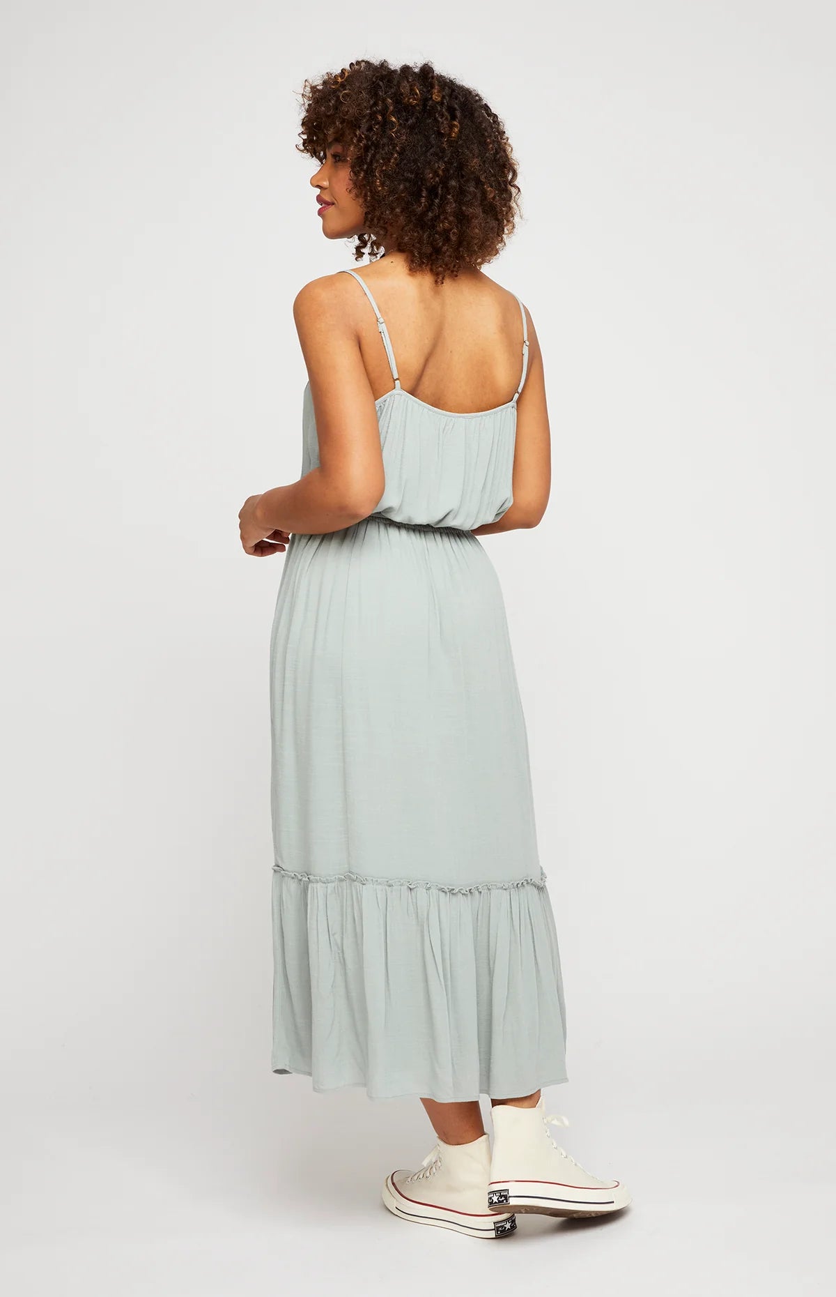 The Russo dress is made of fabric with a subtle crosshatch texture and is fully-lined for ease of wear. Features include an elasticated waistband with removable belt, adjustable straps, and lace detailing along the neckline.