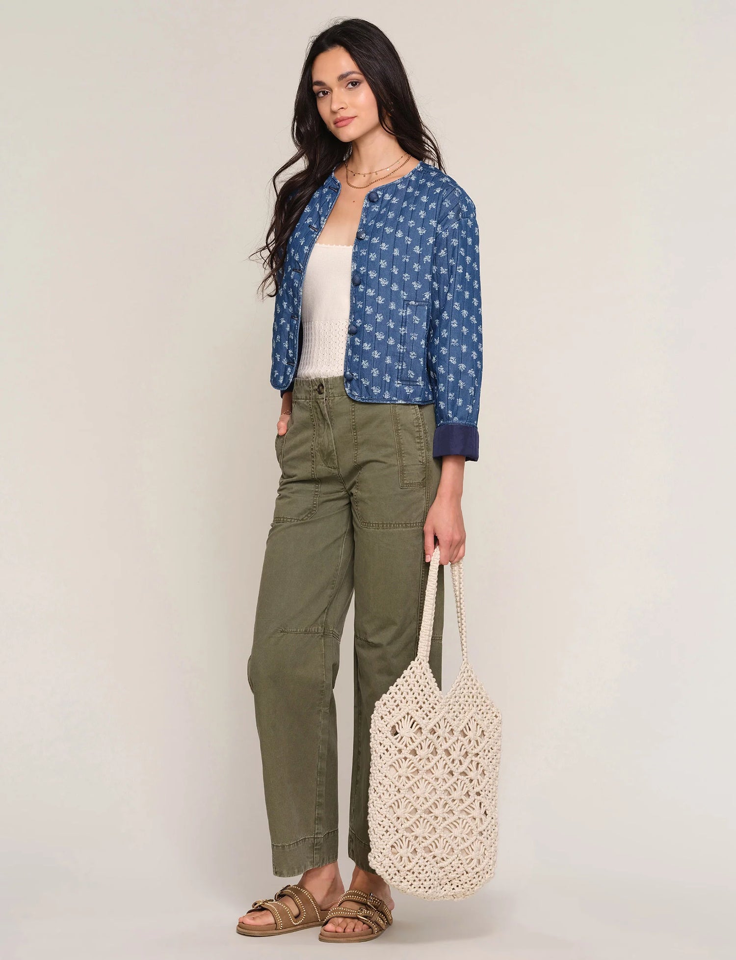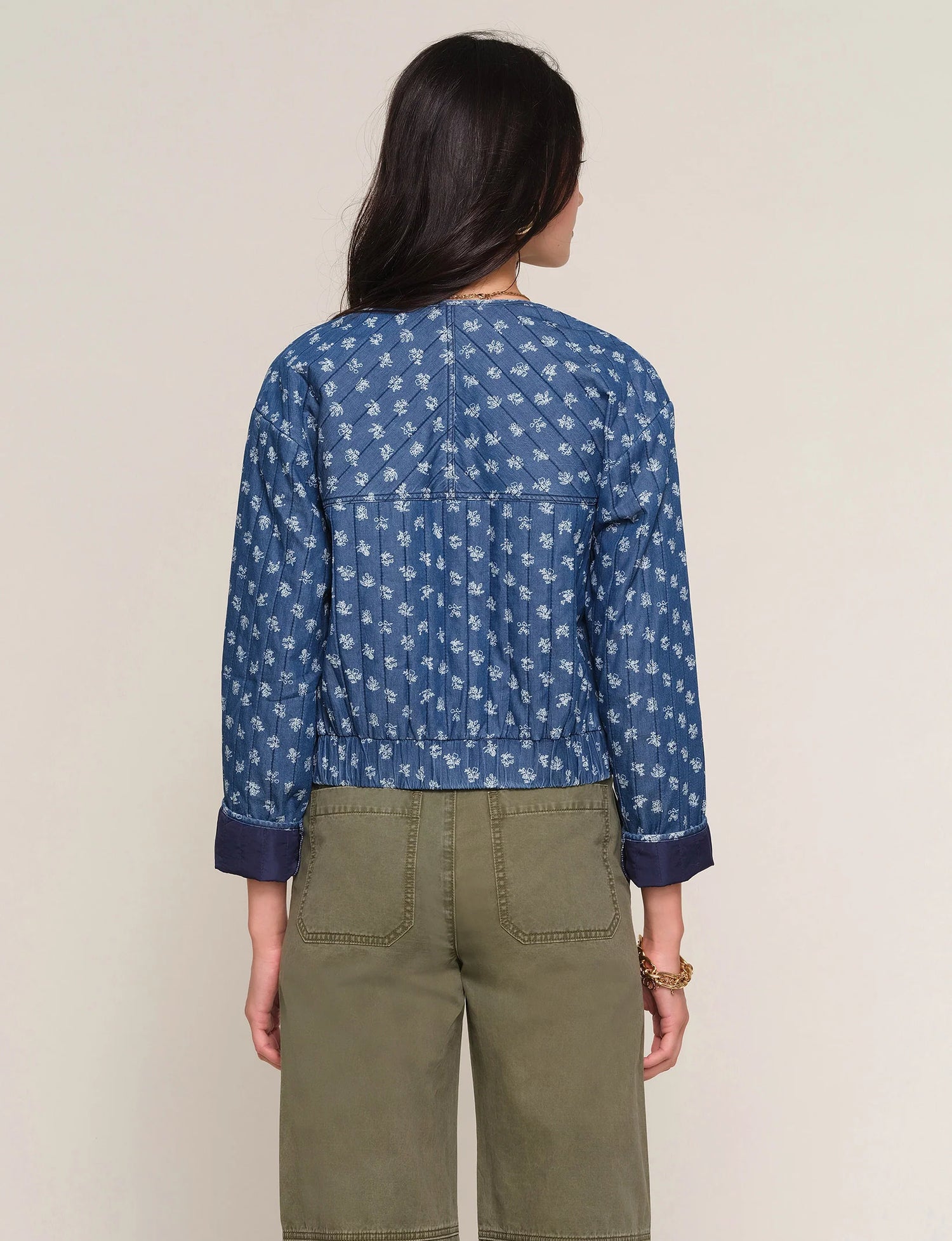 The Sabrina Jacket is a perfect, relaxed fit jacket. It's made from a lightweight, quilted denim that has an ivory, floral print.