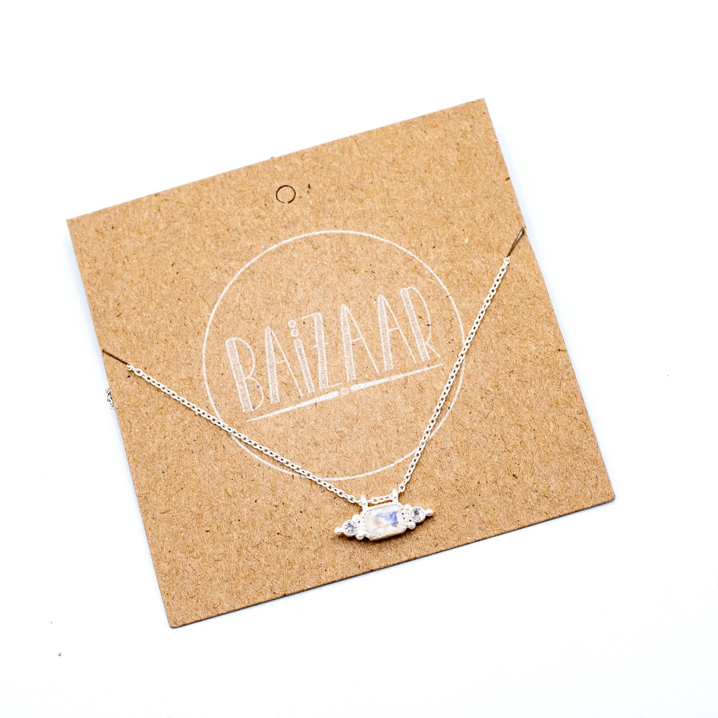 Sterling silver necklace featuring faceted rectangular moonstone with two side moonstones. Adjustable from 16-20 inches, featuring 3 loops for adjusting.