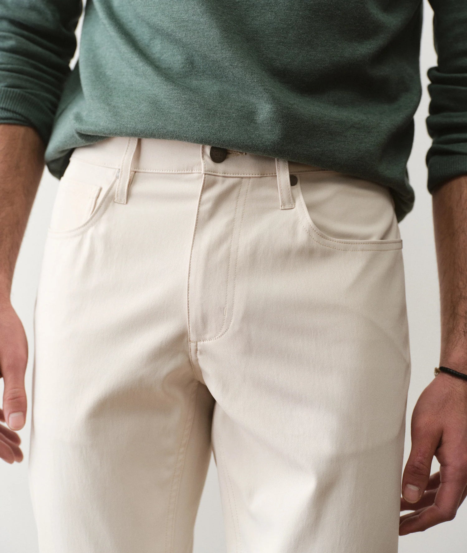 This fabric has mechanical four-way stretch for comfort, and moisture wicking to help keep things dry—but it feels like a normal twill fabric. The best of both worlds.