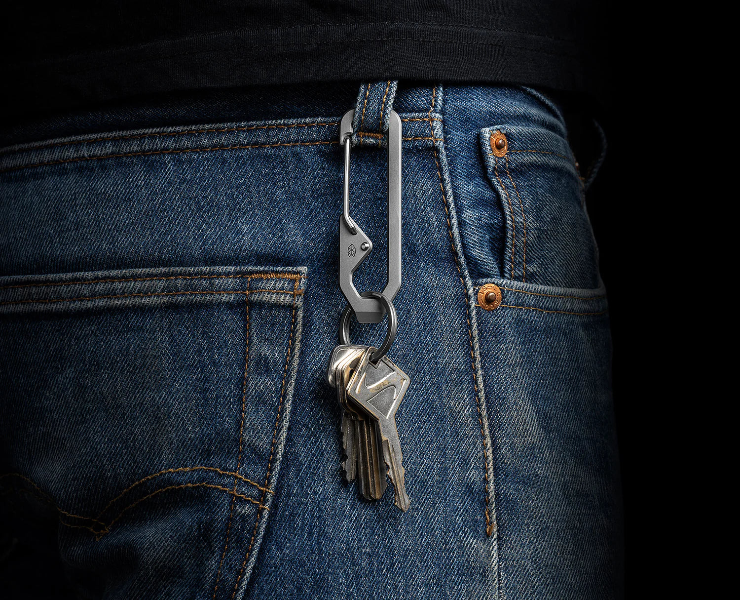 ONE BELT-LOOP WIDE Designed to fit right, hang straight and never rock. ALL THINGS SCRAPER, PRY AND SCREWDRIVER The Holcombe does a lot more than hold your keys. SPRING-LOADED WIRE GATE Durable and secure, no matter where you use it. AVAILABLE IN STAINLESS STEEL AND TITANIUM Choose your poison! LET IT HANG Includes one titanium keyring for threading your keys and whatever else you can fit on there.