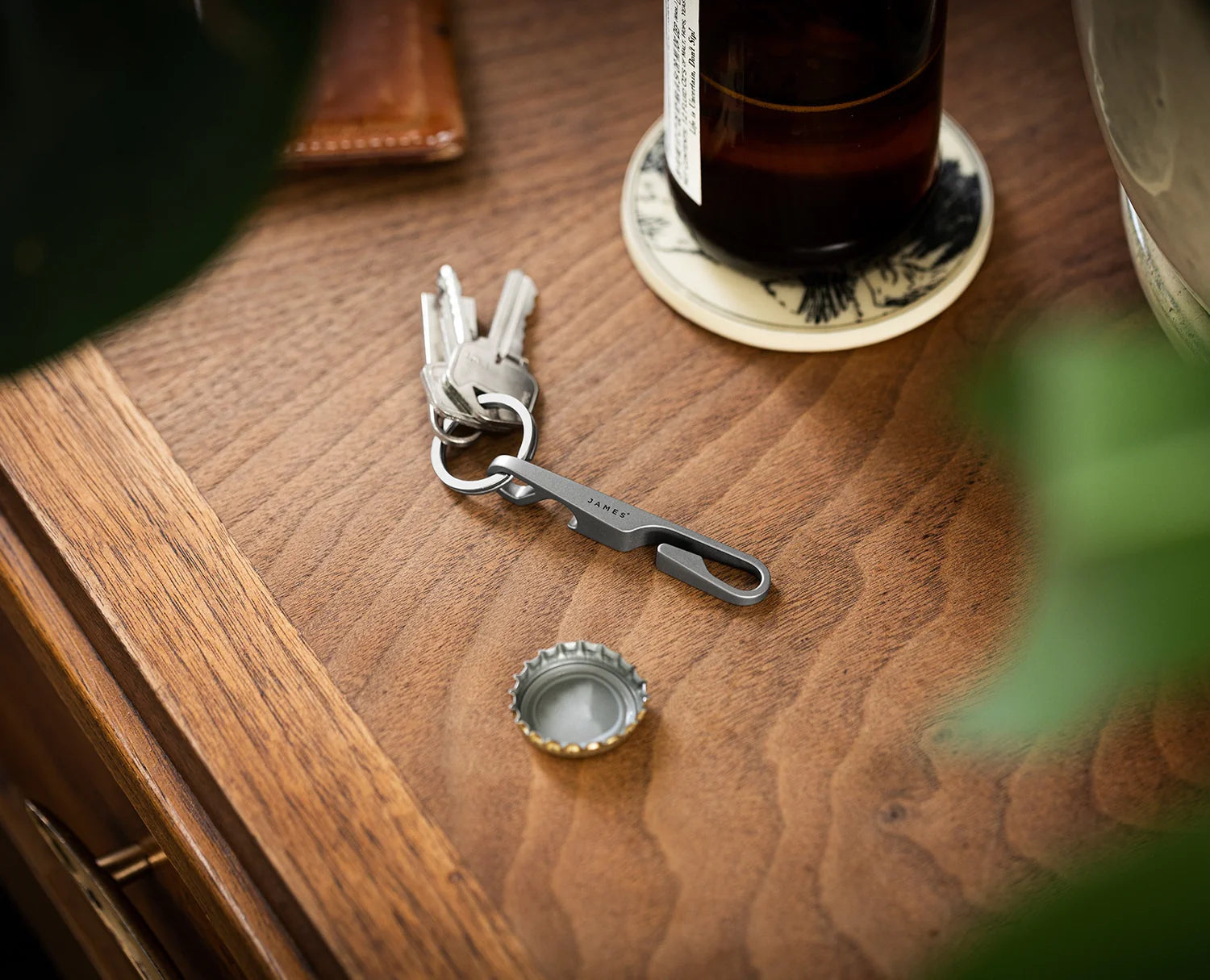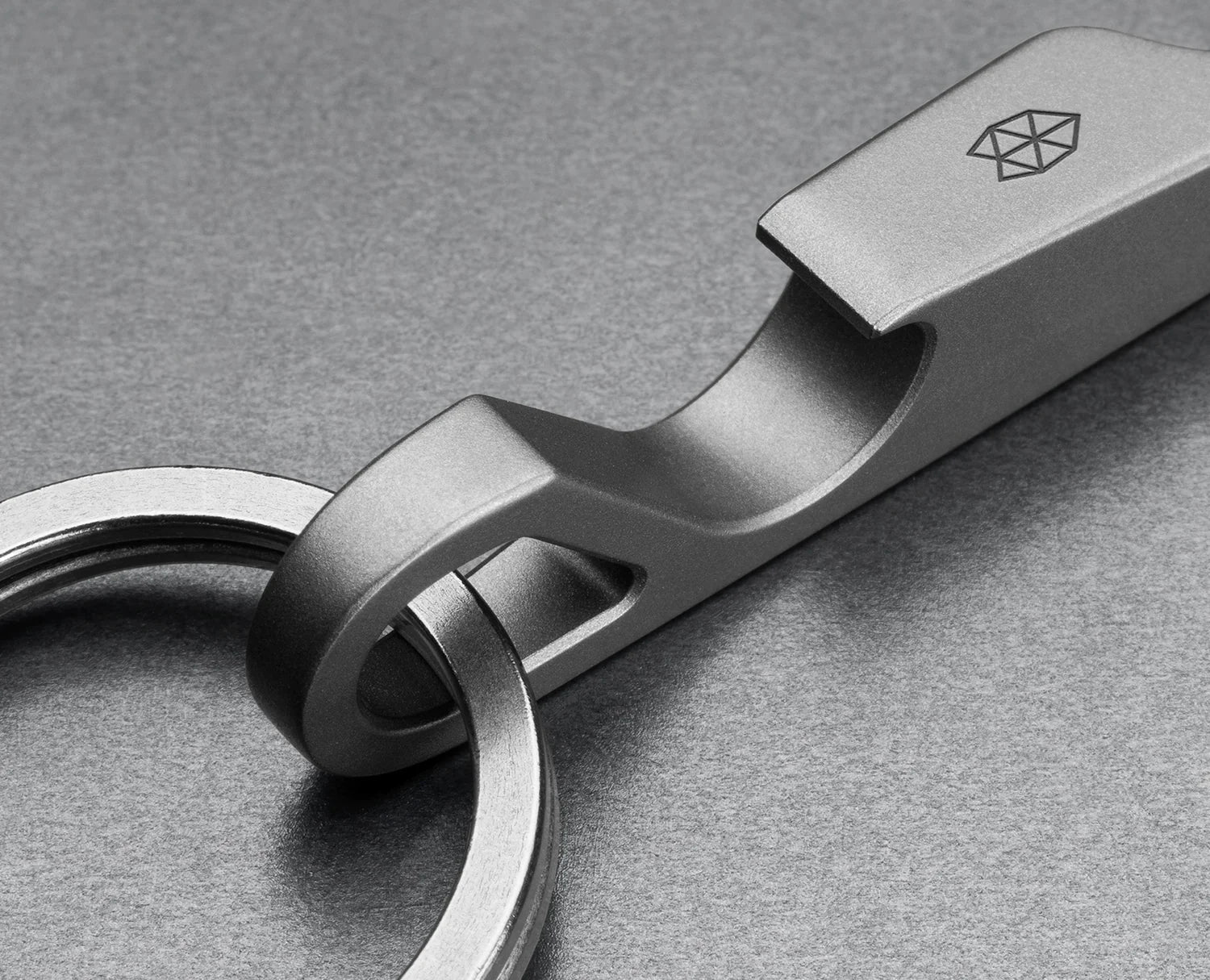 KEY MANAGEMENT Our simplest key management solution. BOTTLE OPENER Includes an integrated bottle opener. You'll be a hero when somebody is searching for a way to open that beer. LET IT HANG Includes one titanium keyring for threading your keys and whatever else you can fit on there.