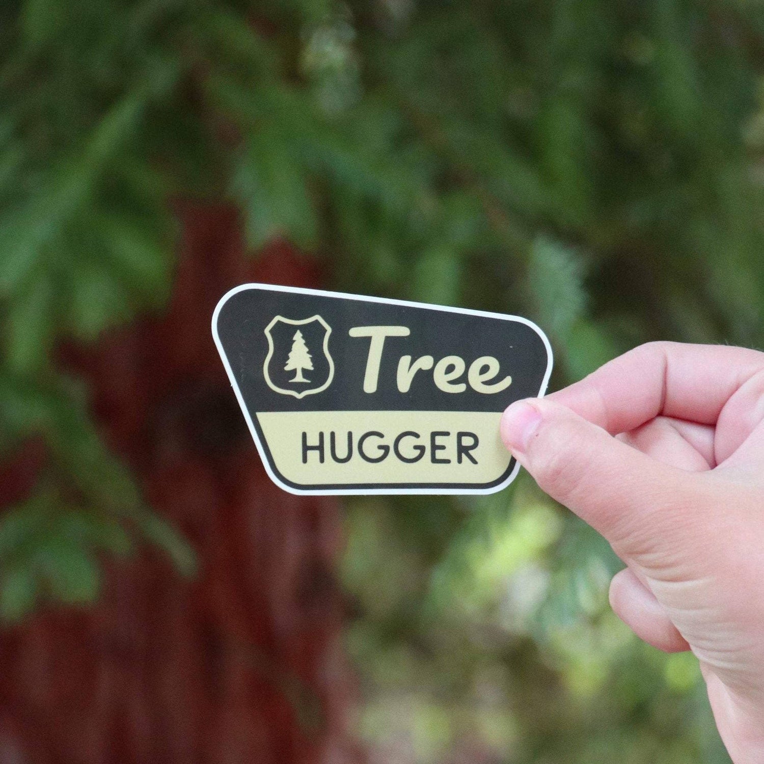3.2" X 2" Glossy Coated Vinyl Sticker Scratch and Weatherproof Tree Hugger. Perfect for a water bottle or laptop. Please Note: Since every computer screen is different the colors here may vary from the actual sticker.