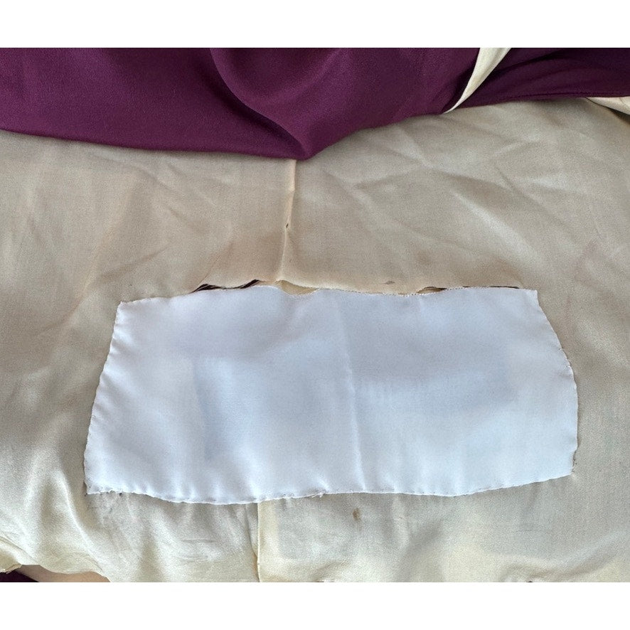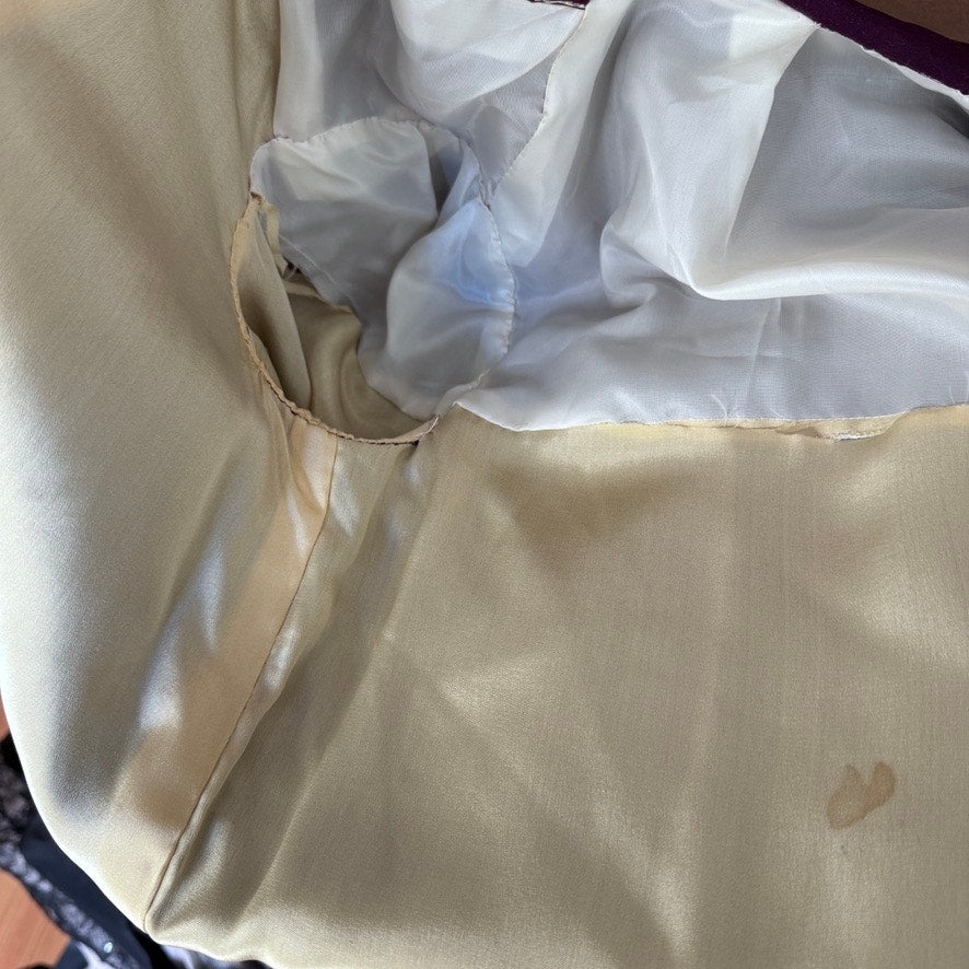 Beautiful and unique piece. There are a few areas of the lining that have been repaired, see photos. The lining is in a delicate state, with some of the seams having slight separation. The exterior fabric of the garment is sturdy and in excellent shape. One small area of fading on the lower part of the garment under the sleeve, visible in photo 5.