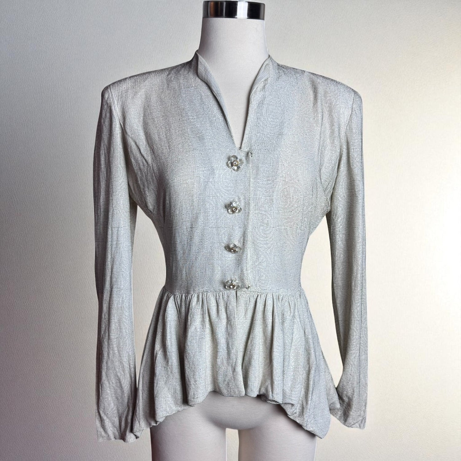 Vintage 1940s Lurex Metallic Button Top Blouse Peplum Hem White Gold Threads
