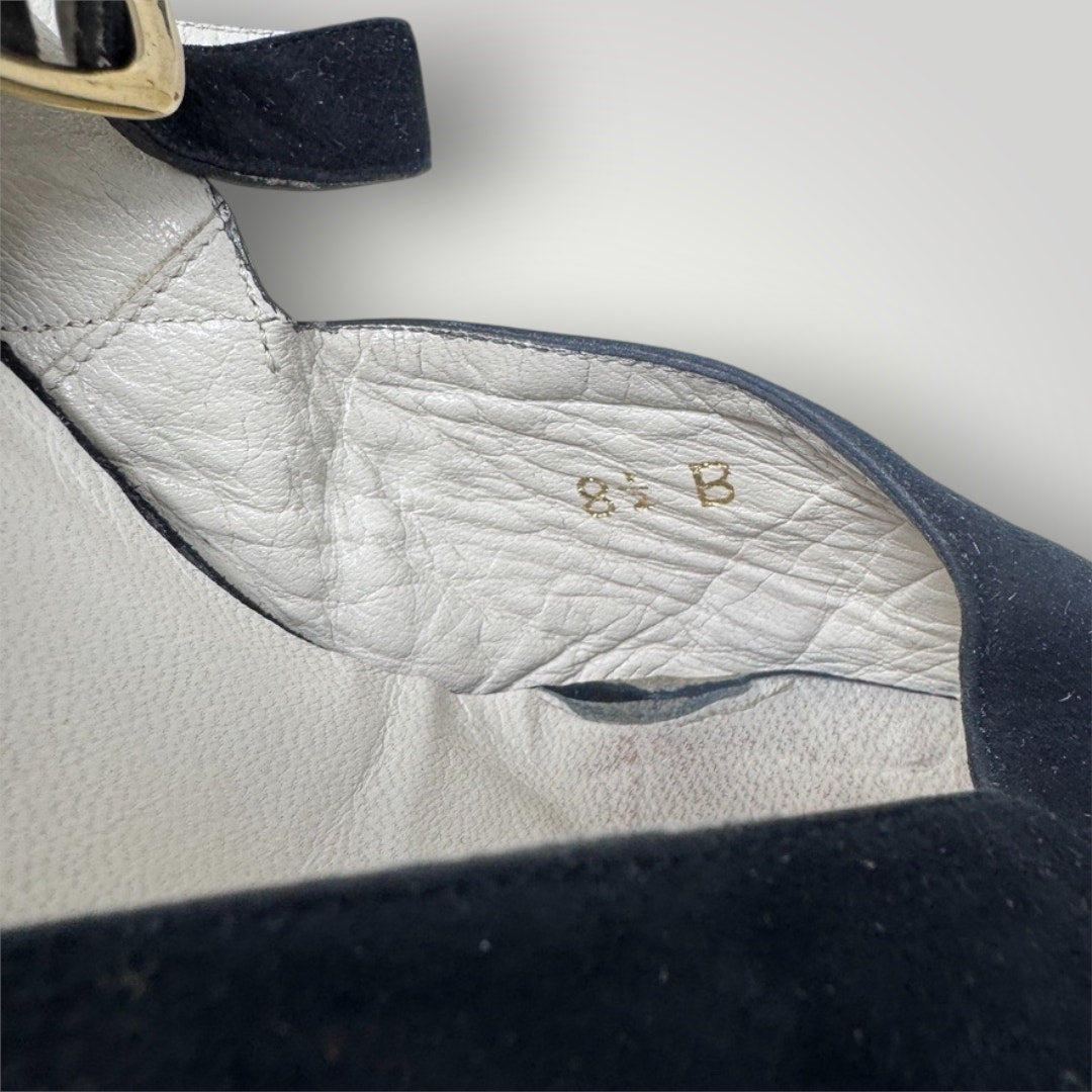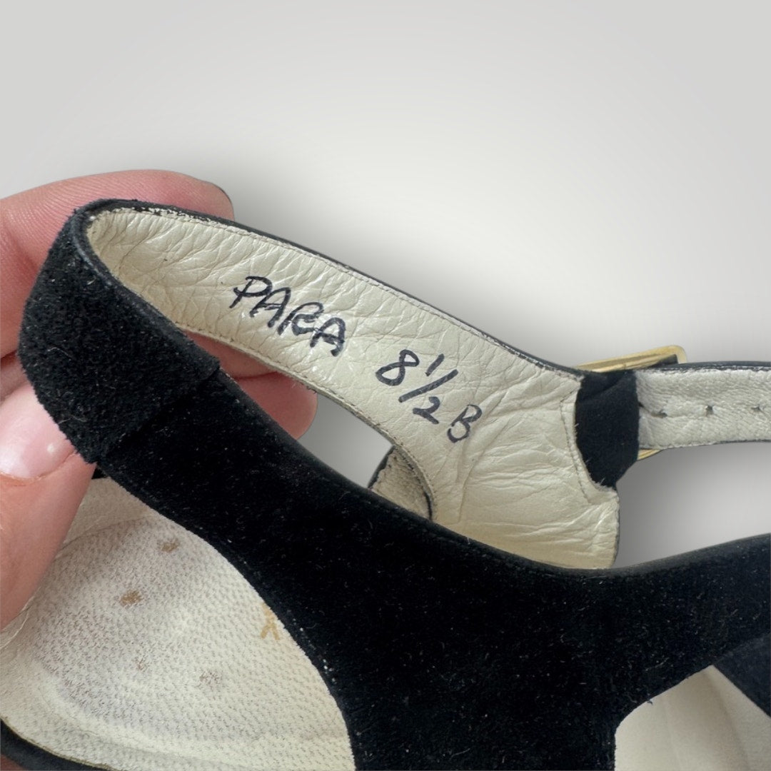 Vintage 8.5 Suede Heel Peep Toe Ankle Strap Black Sculpted Heel Platform