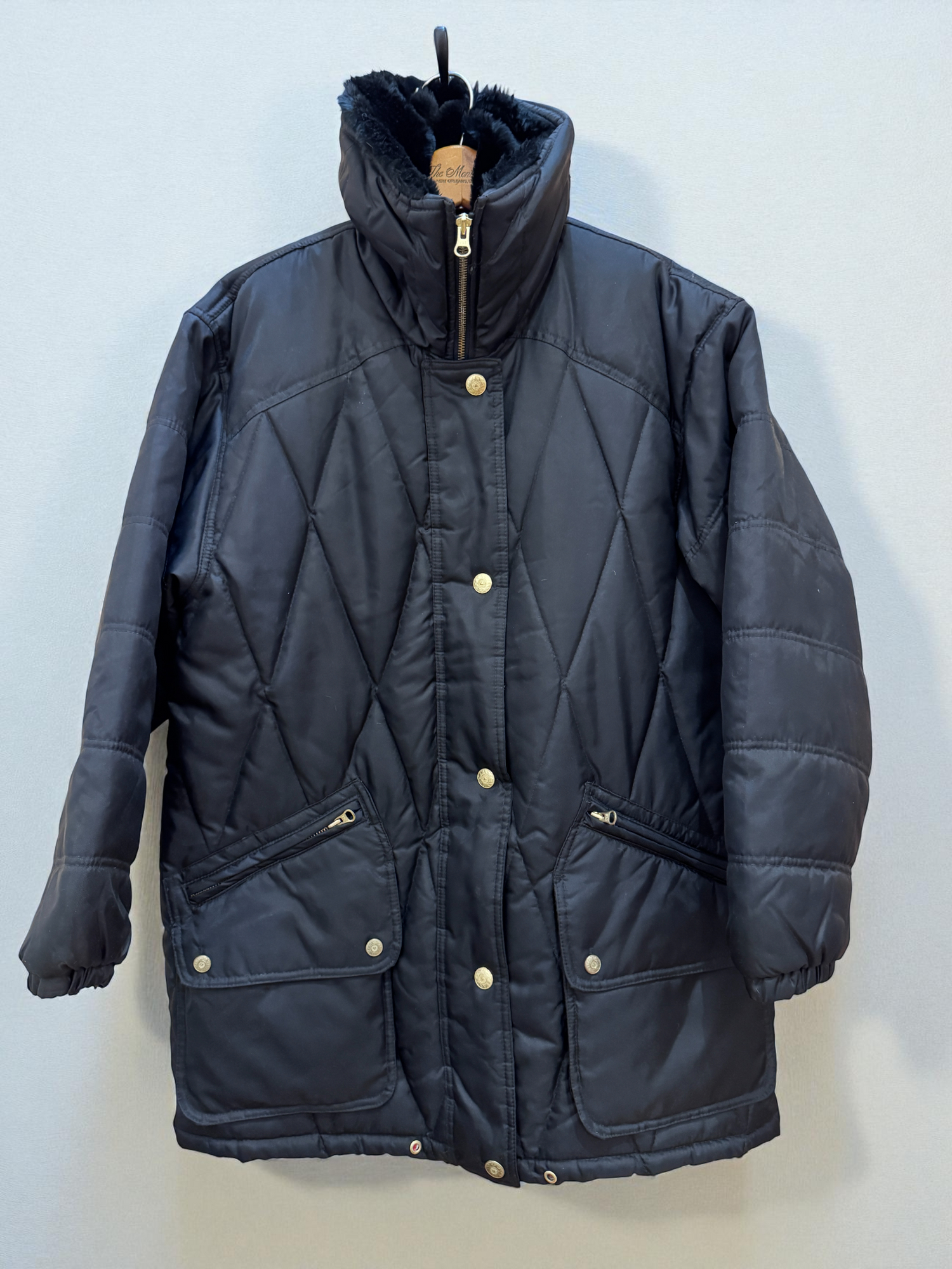 Vtg 1990s Faux Fur Collar Coat Quilted Black Zip Snap Red Lining Oversized