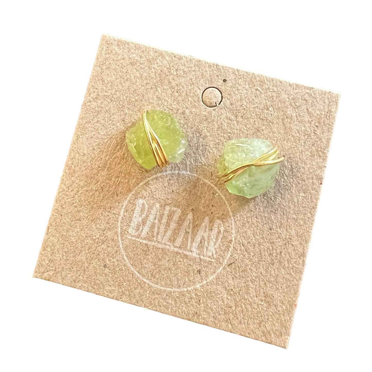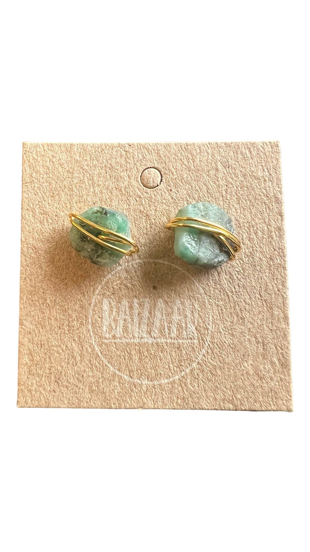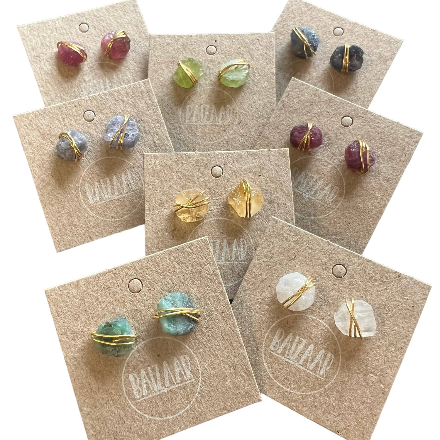 Beautiful raw precious and semi precious stone studs featuring wire wrapped design. Earrings are made in 22K gold plated over brass.