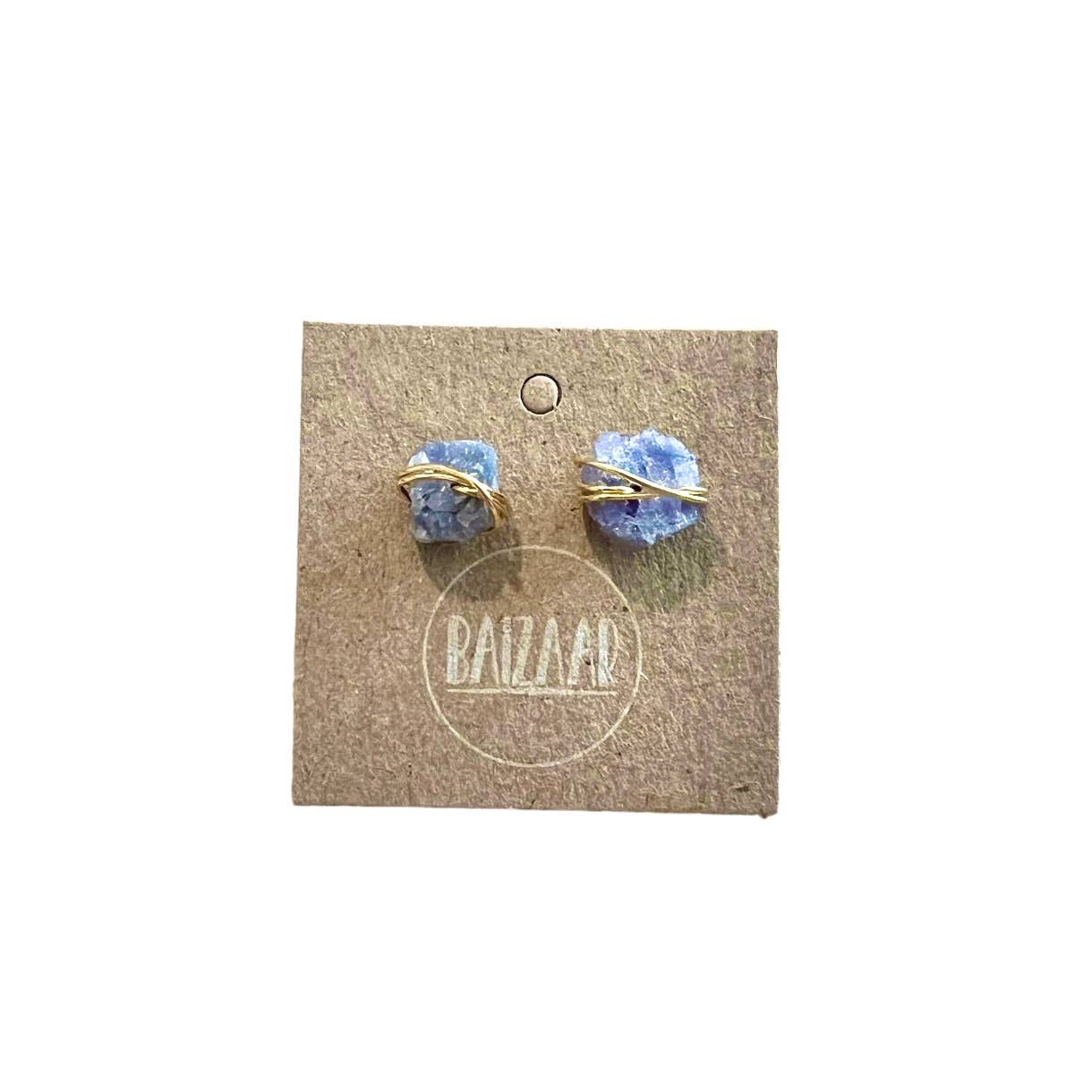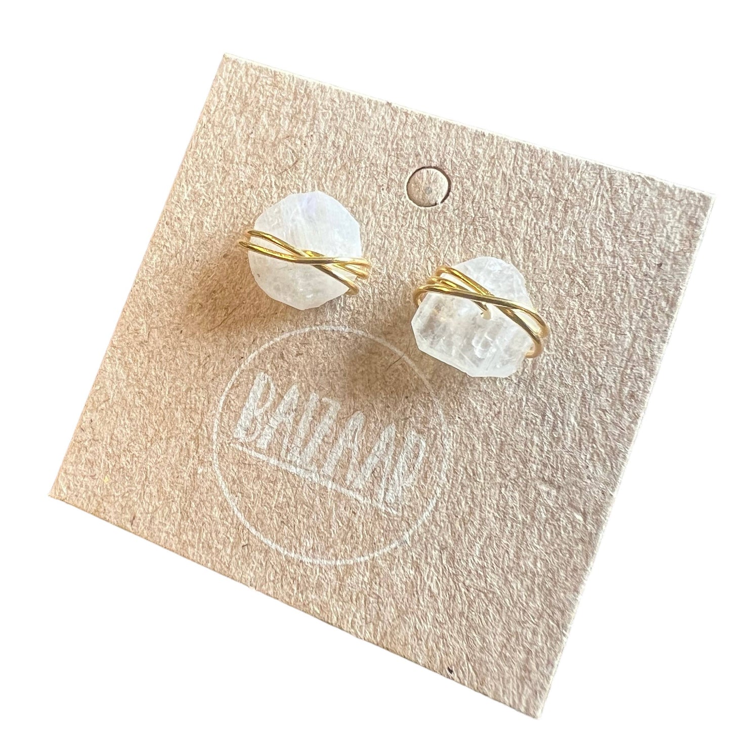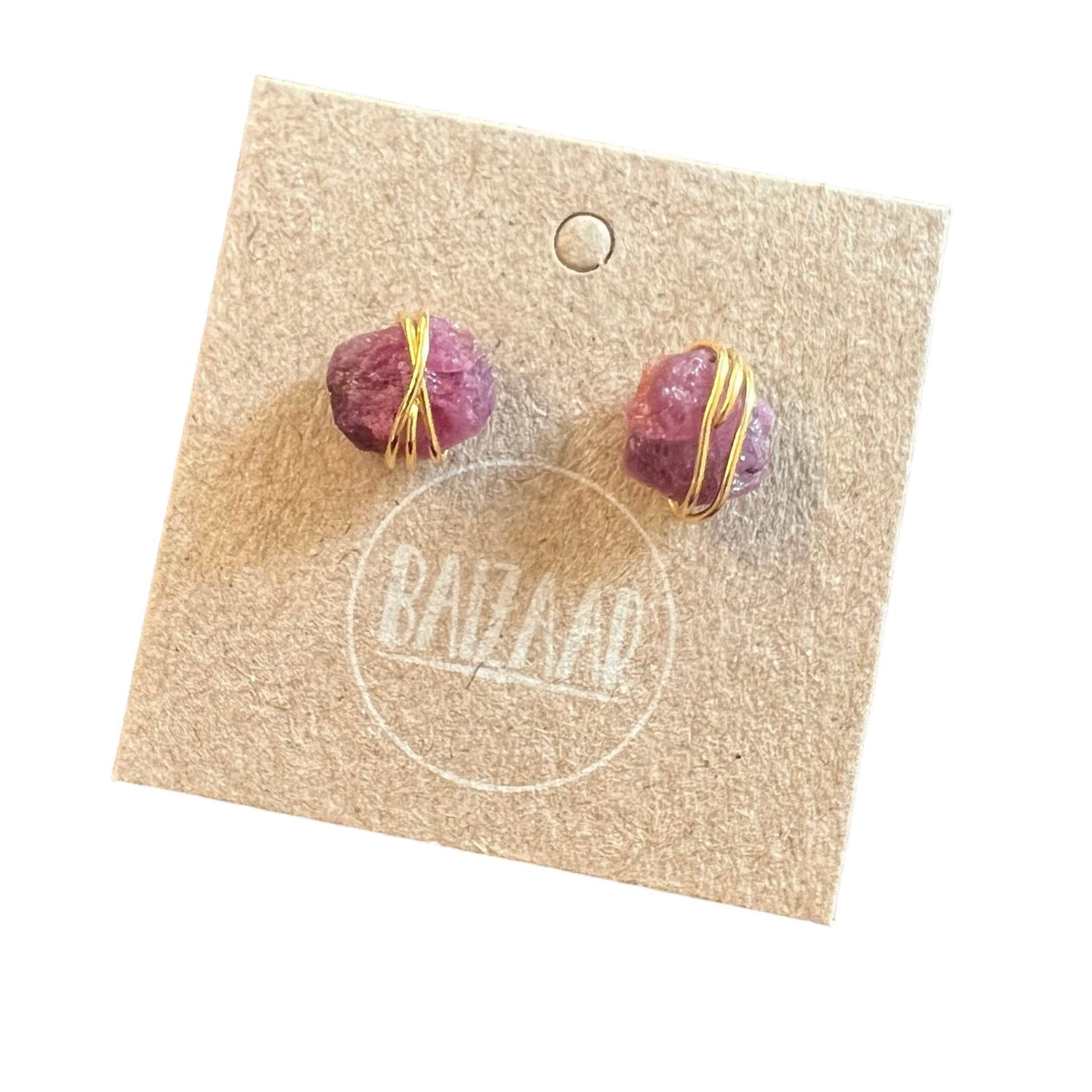 Beautiful raw precious and semi precious stone studs featuring wire wrapped design. Earrings are made in 22K gold plated over brass.